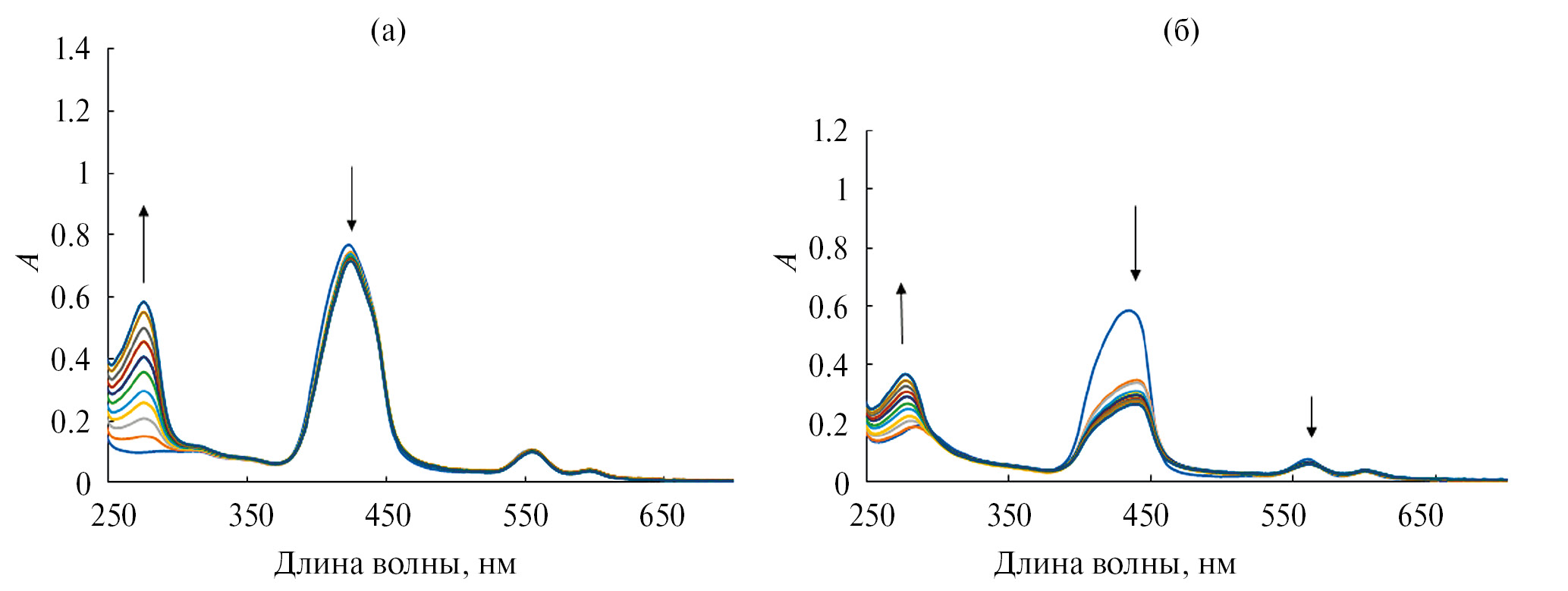 Рис. 2. ЭСП ZnPorS (4.99 x 10–6 М) (а) и ZnPorN (6 x 10–6 М) (б) в PBS–ДМФА (0.19 М) при титровании БСА (0–6 x 10–6 М).