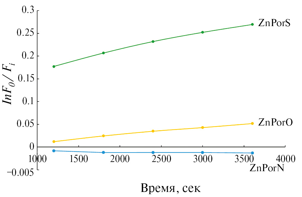 Рис. 4. Константы наблюдаемой скорости фотоокисления БСА в присутствии ZnPorХ при облучении светом 425 нм, оцененные как отношение флуоресценции БСА до облучения (lnF0) к флуоресценции БСА (Fi) при облучении.