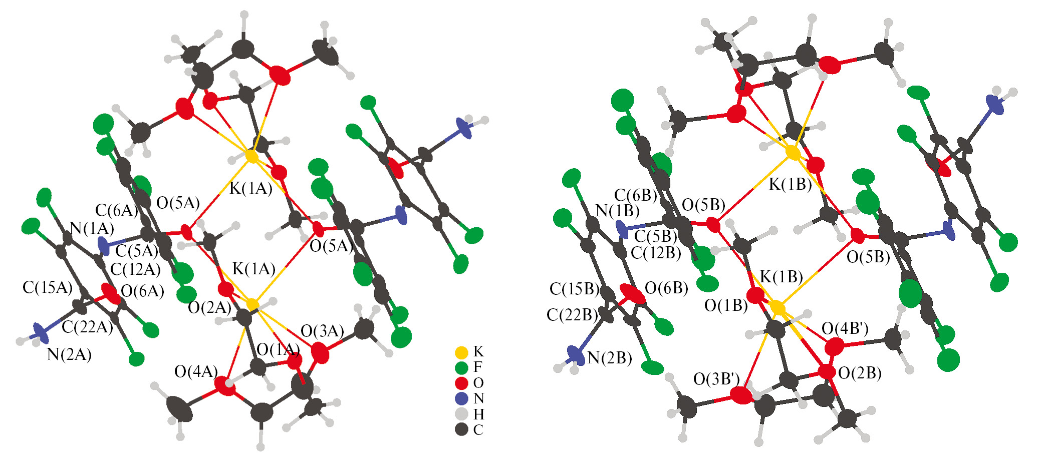 K–O(L) | 2.722(4), 2.739(4) | 2.696(5), 2.756(5) | K(1)O(5)K(1) | 96.79(13) | 94.27(13) |