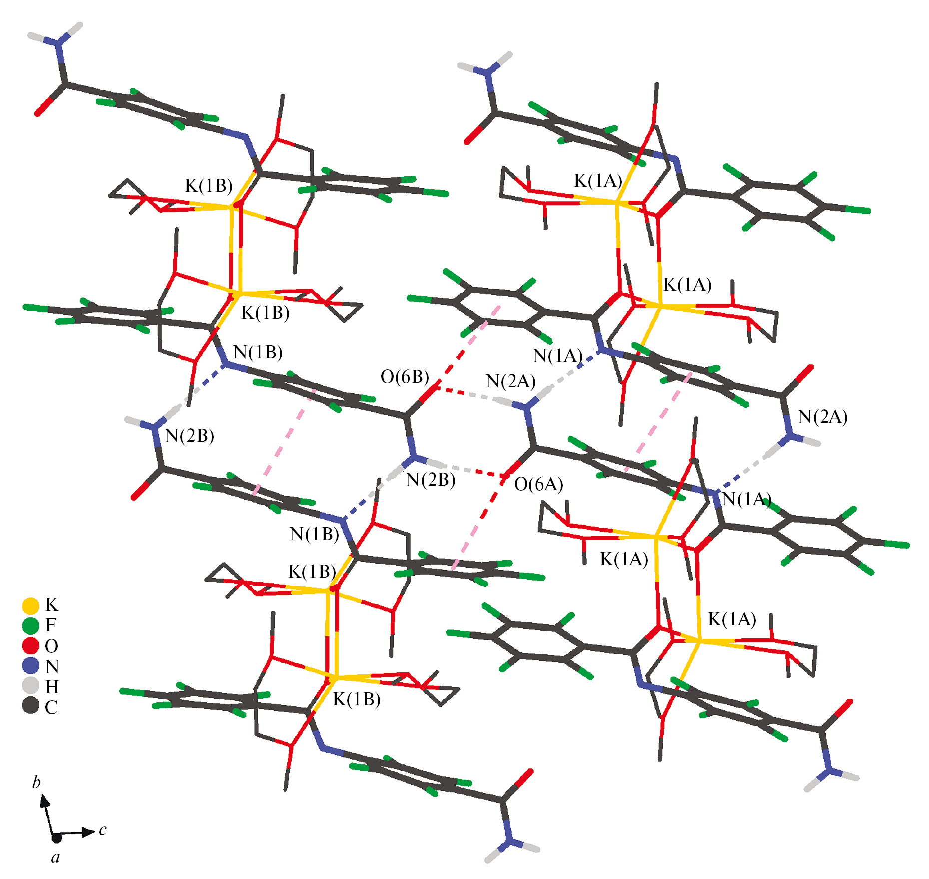 Кристаллическая упаковка I определяется набором межмолекулярных невалентных контактов, в том числе π-стекинг-взаимодействий между тетрафторзамещенными фенильными ароматическими кольцами (табл. 4), контактами C=O…π, N–H…O и N–H…N (табл. 2, 3). Межмолекулярные взаимодействия аромати ческих колец и H-связи между атомом N во фрагменте C6F5–C(O)N– и амидной группой приводят к формированию супрамолекулярных цепочек (рис. 2). Цепочки молекул A выстраиваются вдоль вектора [1 1 0], молекул B — вдоль вектора [0 1 0] или оси 0b, угол между этими векторами составляет 55.4o. Цепочки образуют подрешетки из слоев параллельно плоскости 0ab за счет ван-дер-ваальсовых взаимодействий, включая слабые контакты C–H…F (H…F 2.49, 2.63 Å). Каждая пара цепочек соседних подрешеток связана друг с другом парой H-связей между амидными группами и контактами C=O…π (рис. 2). В результате каждая молекула I участвует в формировании супрамолекулярной цепочки, которая связана с соседними неколлинеарно направленными цепочками, что приводит к формированию слоев, связанных в трехмерную сетку.