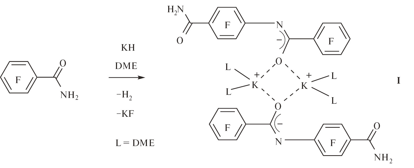 В настоящей работе мы показали, что взаимодействие пентафторбензамида с гидридом калия в среде диметоксиэтана также протекает с замещением атома фтора в пара-положении фенильного кольца одной молекулы пентафторбензамида на пентафторбензамидную группу другой с образованием калиевой соли вида {(DME)2K+[C6F5–C(O)N–C6F4–C(O)NH2]–}2 (I).