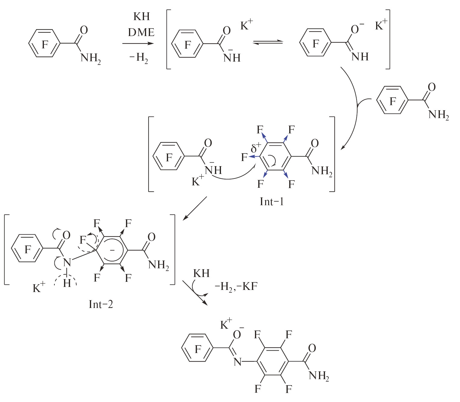Следует отметить, что способность калиевых солей типа C6F5–XK к активации связей C–F известна достаточно давно. Одним из первых примеров такой активации, по-видимому, является получение поли(тетрафторфениленсульфида) (C6F4S)n путем нагревания пентафтортиофенолята калия C6F4–SK в вакуумированной запаянной ампуле при температуре 240°C в течение трех часов [48, 49]. Предполагаемый механизм замещения атома фтора в FBAm с образованием димера представлен на схеме 2. В ходе реакции мы наблюдали выделение водорода, это позволяет предположить, что на первом этапе образуется монокалиевая соль пентафторбензамида, которая далее реагирует со свободным перфторбензамидом с промежуточным образованием слабосвязанного интермедиата Int-1, из которого при переносе отрицательного заряда на перфторированное кольцо пентафторбензамида образуется интермедиат Int-2, перераспределение зарядов и связей в котором с выделением протона и фторид-аниона в присутствии второй молекулы KH приводит к выделению водорода и фторида калия с образованием конечного продукта I. Данный механизм можно рассматривать как нуклеофильное замещение атома фтора в ароматическом кольце SNAr, описанное в ряде работ [5, 37–42].