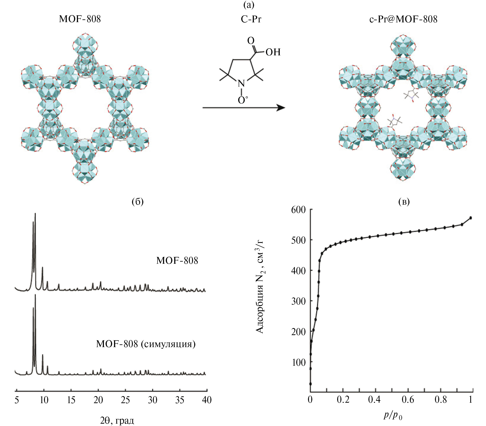 Рис. 1. Схематическое изображение модификации MOF-808 радикалом 3-карбокси-2,2,5,5-тетраметилпирролидин 1-оксил (c-Pr). Бирюзовыми полиэдрами показаны циркониевые кластеры, красным цветом — атомы кислорода, серым — атомы углерода и сиреневым — азот (а); данные порошковой рентгеновской дифракции для образца MOF-808 по сравнению с теоретически смоделированной дифрактограммой (CCDC № 1871192) (б); изотерма сорбции N2 для образца MOF-808 (в).