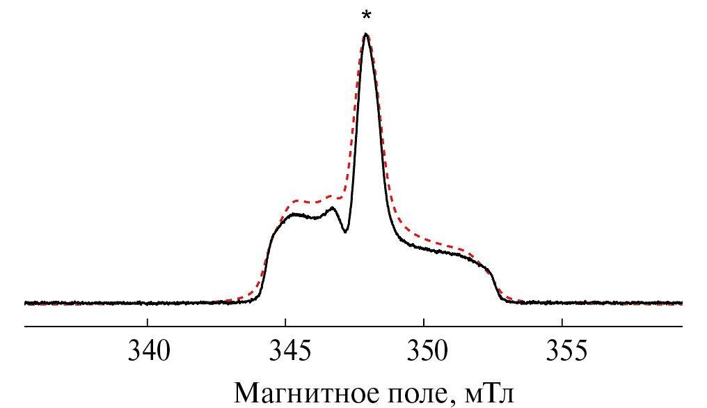 Рис. 3. ЭПР-спектр, детектируемый по спаду свободной индукции, для образца c-Pr@MOF-808_нз, измеренный при комнатной температуре; звездочкой отмечено положение поля, в котором было измерено T2. Моделирование показано красным пунктиром.