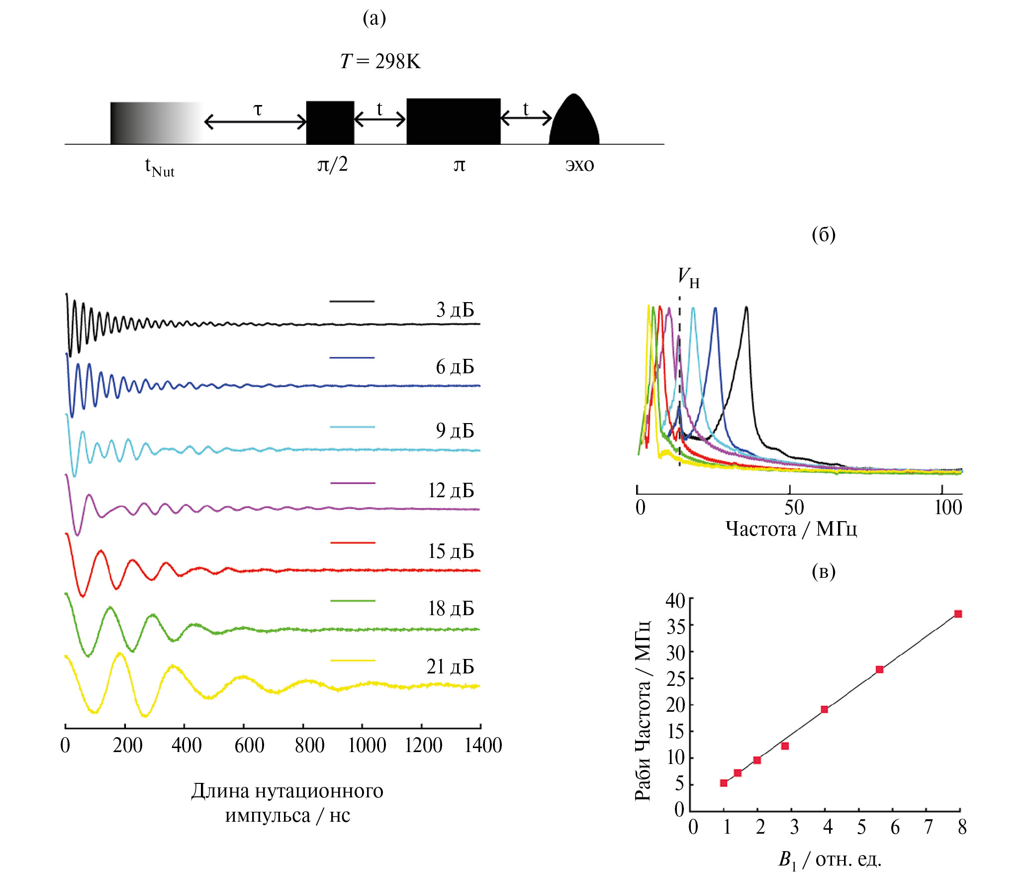Oтметим, что характерного времени фазовой когерентности, измеренного при комнатной температуре для c-Pr@MOF-808_нз и равного 0.39 мкс, достаточно, чтобы показать возможность использования радикала c-Pr как кандидата на роль кубита. Поэтому далее был проведен нутационный эксперимент, показывающий возможность манипуляции спинами. Нутационный эксперимент проводился при комнатной температуре в Х-диапазоне путем варьирования мощности нутационного импульса. Сначала электронная намагниченность переворачивается микроволновым импульсом, длина которого меняется в ходе эксперимента, и далее происходит детектирование сигнала стандартной эхо-детектирующей последовательностью. На рис. 5а показаны полученные осцилляции Раби при комнатной температуре. При величинах аттенюации 9 дБ и 12 дБ (т.е. при высокой мощности СВЧ) наблюдаются протонные модуляции сигнала, что связано с близостью Раби частоты и Ларморовской частоты прецессии протонов (14.902 МГц). Также на рис. 5в показана линейная зависимость частоты осцилляций Раби от микроволновой мощности, что подтверждает возможность манипулирования спинами.