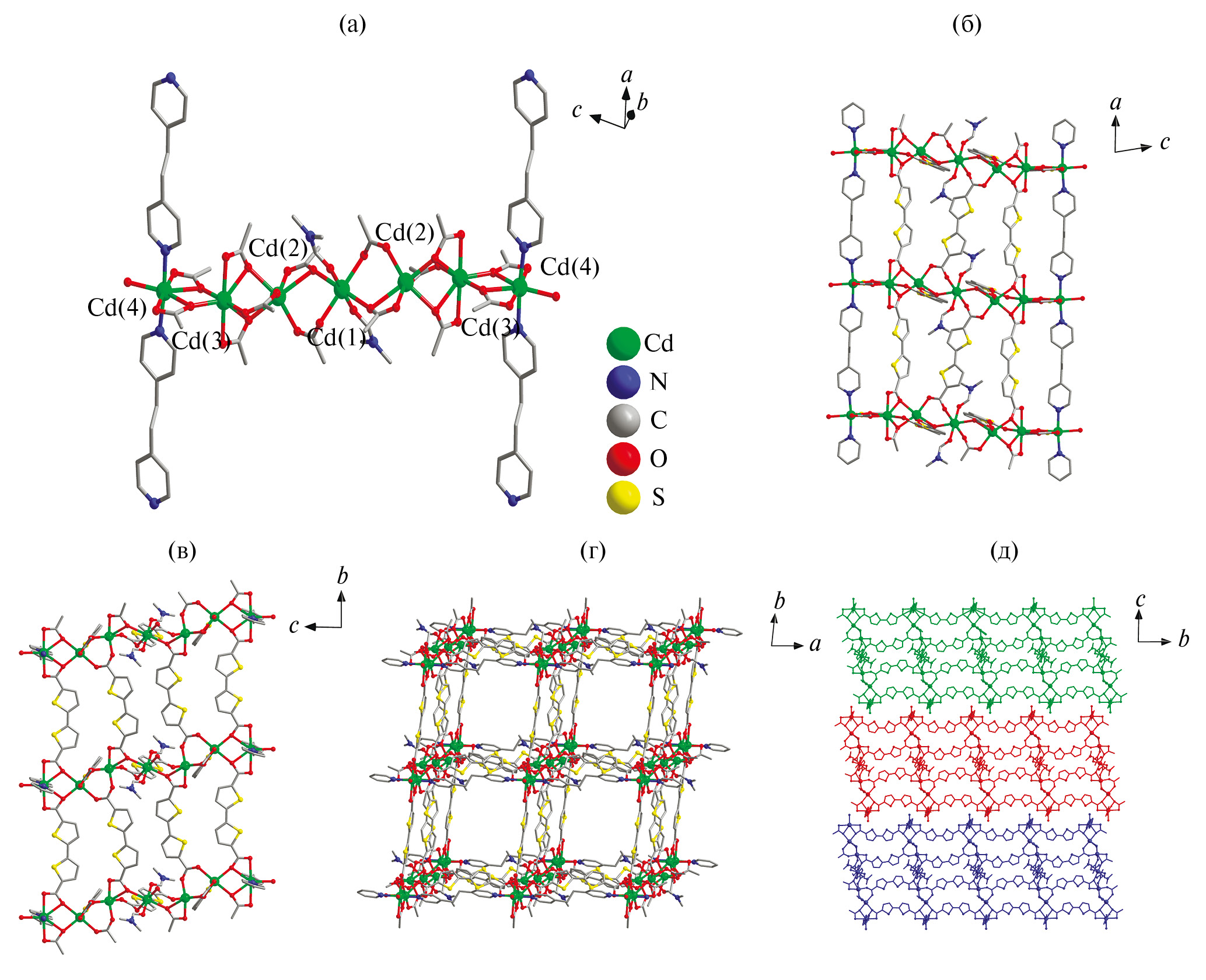 Бесцветные кристаллы соединений [Cd7 (Btdc)7(Bpa)2(Dmf)2(H2O)2] · 15 Dmf · 2H2O (I) и [Cd7(Btdc)7(Bpe)2(Dmf)2] · 15Dmf · 3H2O (II) были получены нагреванием смеси Cd(NO3)2, H2Btdc и N-донорного мостикового лиганда (Bpa или Bpe соответственно) в растворе ДМФА. Кристаллы II имеют игловидную форму, а кристаллы I — форму пластин. Согласно данным рентгеноструктурного анализа, оба соединения кристаллизуются в триклинной пространственной группе P¯1. Состав каркасов отличается природой мостикового N-донорного лиганда и наличием координированных лигандов H2O в I. В основе обоих соединений лежит линейный семиядерный строительный блок {Cd7} схожего строения, поэтому более детально его структура будет рассмотрена на примере соединения I. Асимметрическая часть I содержит четыре независимых катиона кадмия(II) с отличающейся геометрией и координационным окружением. Атом Cd(1) находится в центросимметричном октаэдрическом окружении, состоящем из четырех атомов кислорода, принадлежащих четырем карбоксилатным группам, и двух атомов кислорода двух координированных молекул ДМФА. Длины связей Cd(1)–OBtdc находятся в диапазоне от 2.234(4) до 2.327(3) Å, в то время как длина связи Cd(1)–OДМФА составляет 2.284(4) Å. Координационное окружение Cd(2) состоит из двух атомов кислорода хелатной карбоксилатной группы и четырех атомов кислорода, принадлежащих четырем мостиковым карбоксилатным группам. Координационное число Cd(2) равно 6, а координационное окружение имеет форму сильно искаженного октаэдра. Длины связей Cd(2)–O находятся в диапазоне от 2.168(3) до 2.562(4) Å. Координационное окружение атома Cd(3) состоит из четырех атомов кислорода двух хелатных карбоксилатных групп (при этом один атом кислорода в каждой из СОО-групп является мостиковым между Cd(2) и Cd(3)), двух атомов кислорода двух карбоксилатных групп, хелатирующих Cd(4), и атома кислорода мостиковой карбоксилатной группы, соединяющей Cd(2) и Cd(3). Длины связей Cd(3)–O находятся в диапазоне от 2.168(3) до 2.562(4) Å. Координационное число Cd(3) равно 7 и имеет форму, близкую к пентагональной бипирамиде. Координационное окружение атома Cd(4) состоит из четырех атомов кислорода двух хелатных карбоксилатных групп, двух атомов азота, принадлежащих двум молекулам Bpa, а также атома кислорода координированной молекулы воды. Длины связей Cd(4)–OBtdc находятся в интервале от 2.441(4) до 2.484(4) Å, а длина связи Cd(1)–OH2O составляет 2.332(5) Å. Длины связей Cd(4)–N составляют 2.257(5) Å и 2.273(5) Å. Координационное число Cd(4) равно 7, а окружение катиона имеет форму искаженной пятиугольной бипирамиды. Семь атомов кадмия образуют семиядерный линейный блок {Cd7(R-COO)14(N-R)4(Dmf)2(H2O)2} (R–COO = = карбоксилатный остаток лиганда Btdc, N–R = = пиридиновый фрагмент лиганда Bpa) с последовательностью катионов в цепочке Cd(4)–Cd(3)–Cd(2)–Cd(1)–Cd(2)–Cd(3)–Cd(4) (рис. 1а). Цепочка симметрична относительно центра (катион Cd(1)), а на ее краях располагаются координированные аквалиганды, расстояние между которыми составляет ~27 Å. Органические лиганды связывают цепочечные блоки {Cd7} друг с другом в двух перпендикулярных направлениях, причем в направлении кристаллографической оси а в связывании участвуют три лиганда Вtdc2– и два лиганда Bpa, а в направлении оси b — четыре лиганда Btdc2–. В итоге реализуются слоистые мотивы с немного искаженной плоскоквадратной топологией с размером окошек около 6 × 8 Å (рис. 1б–1г). Из семи лигандов Btdc2– только один имеет вытянутую анти-конформацию, с п