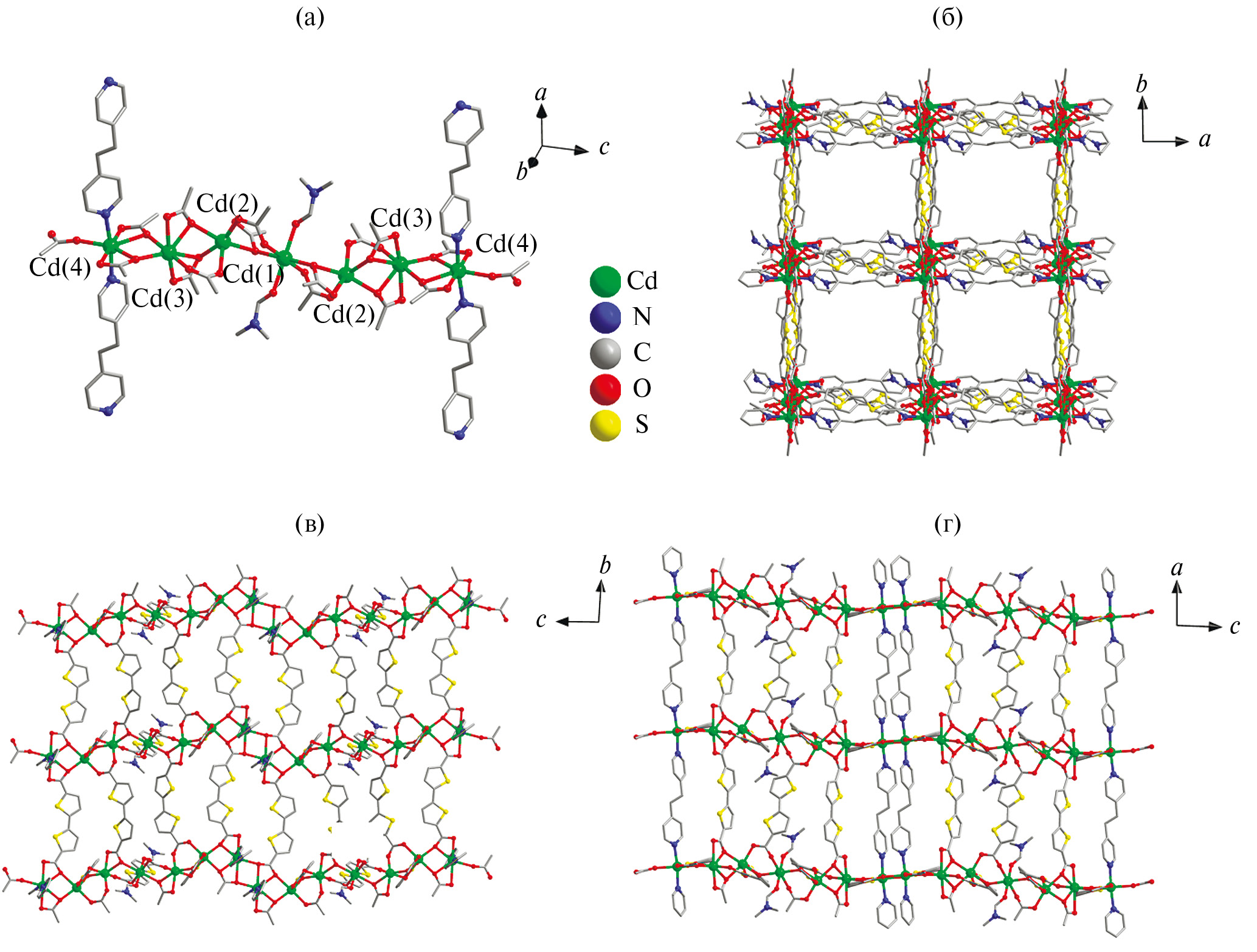 Как и в соединении I, кристаллическая структура II построена на основе семиядерных блоков {Cd7} (рис. 2а). Важным отличием соединения II является отсутствие аквалигандов на концах этих цепочек, хотя при этом пентагонально-бипирамидальная геометрия с КЧ 7 для периферийных атомов Cd(4) сохраняется. Недостающая позиция в полиэдре катиона Cd(4) реализуется за счет дополнительной координации кислорода карбоксильной группы, связанной с аналогичным периферийным катионом Cd(4), принадлежащим соседнему блоку с образованием ромбов {Cd2O2}. Таким образом, в структуре II дискретные фрагменты {Cd7} сцепляются друг с другом с образованием непрерывных 1D-координационных мотивов, тянущихся вдоль кристаллографической оси c. Эти цепочечные мотивы связаны в двух перпендикулярных направлениях через мостиковые органические лиганды с образованием каркасной структуры, внутри которой формируются канальные поры с квадратной геометрией (рис. 2б–2г). Размер каналов составляет около 7 × 8 Å, а свободный доступный объем структуры II, рассчитанный программой PLATON [22], составляет 48%. Каналы заполнены гостевыми молекулами ДМФА и H2O, часть из которых удалось локализовать из данных монокристальной рентгеновской дифракции. Окончательный гостевой состав в II был определен путем согласования данных РСА, SQUEEZE/PLATON, ЭА, ТГА и ИК-спектроскопии.