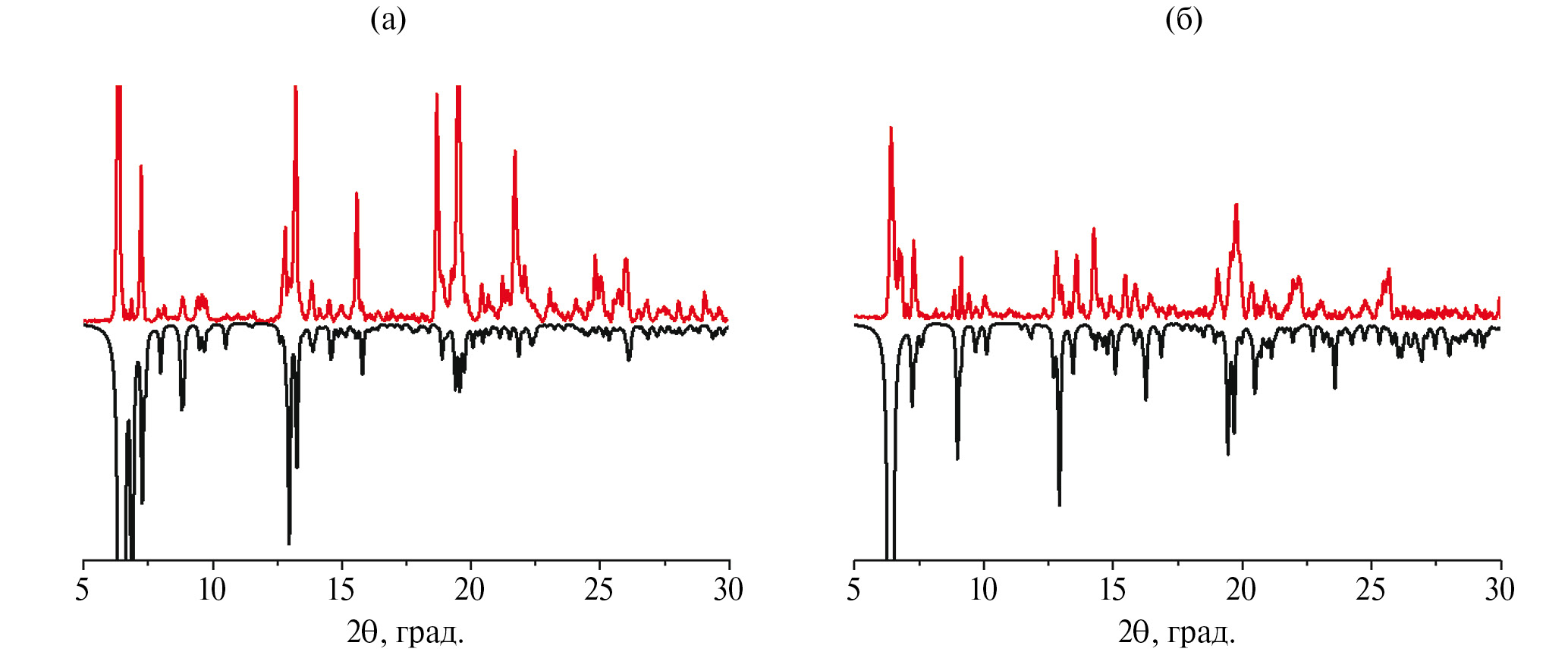 Рис. 3. Сравнение экспериментальной (красный) и теоретической (черный) порошковых дифрактограмм для соединений I (а) и II (б).