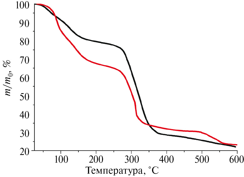 Рис. 4. Термогравиметрические кривые для соединений I (красный) и II (черный).