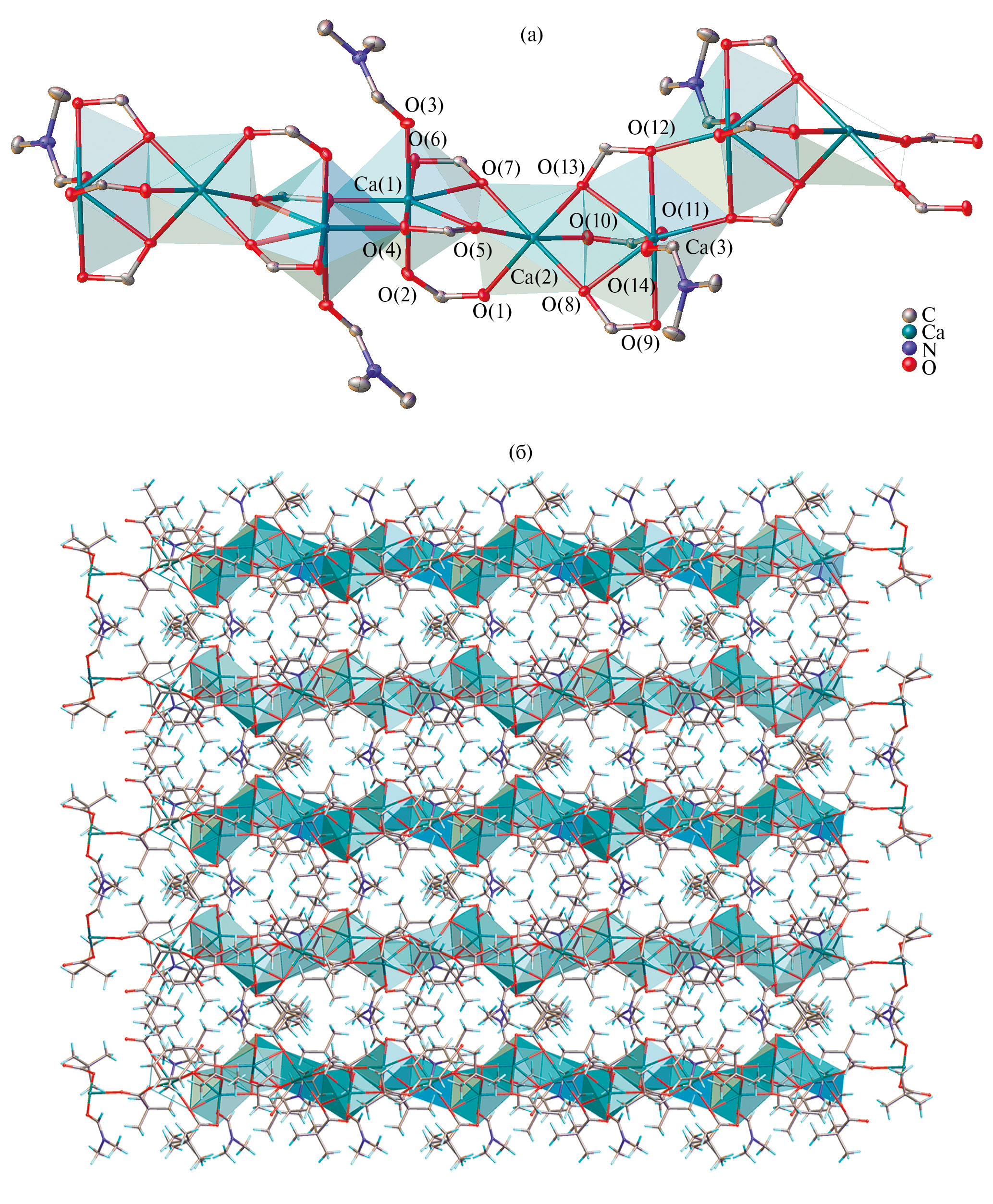 Соединение II также кристаллизуется в моноклинной пространственной группе P21/c и представляет собой 1D-полимерную структуру (рис. 2), однако, ее строение совершенно отлично от I. В II на один атом Ca приходится два Piv-аниона, один из которых располагается во внешней сфере, две молекулы воды, кроме того, одно из положений занимают молекула ДМФА или молекула воды. При этом молекула ДМФА разупорядочена по двум положениям, в результате соотношение частей составляет 0.33 : 0.33 : 0.33. В третьей части, помимо координированной воды, появляется также еще одна молекула воды во внешней сфере, заселенность которой, соответственно, составляет также 0.33. Восьмикоординированные полиэдры кальция представляют собой квадратные антипризмы (1.407 и 1.990 для первой и второй частей разупорядоченной молекулы ДМФА и 1.567 для молекулы воды), образованные одним хелатно координированным и двумя мостиковыми пивалат-анионами, тремя молекулами воды и атомом кислорода неупорядоченных молекул воды и ДМФА. Расстояния Ca–O находятся в пределах 2.357(4)–2.538(4) Å. Атомы кальция находятся на расстоянии 3.6013(10) Å и образуют плоскость. По две противоположные стороны от нее располагаются Piv-анионы, плоскости хелатных циклов CaO2C при этом располагаются под углом примерно 15˚ относительно плоскости, образованной атомами металла. Неупорядоченные молекулы ДМФА/H2O находятся между плоскостями, образованными карбоксилатными группами, и смотрят вверх относительно плоскости металлов; таким образом, в указанных трех направлениях поверхность полимера состоит из гидрофобных фрагментов. В свою очередь, снизу от плоскости, образованной металлами, расположены молекулы воды, образуя гидрофильный слой, с которым сильными водородными контактами OH···O связываются внешнесферные Piv-анионы (табл. 2). За счет этой гидрофильной прослойки полимерные цепи связываются в слои, образующие кристаллическую упаковку соединения.