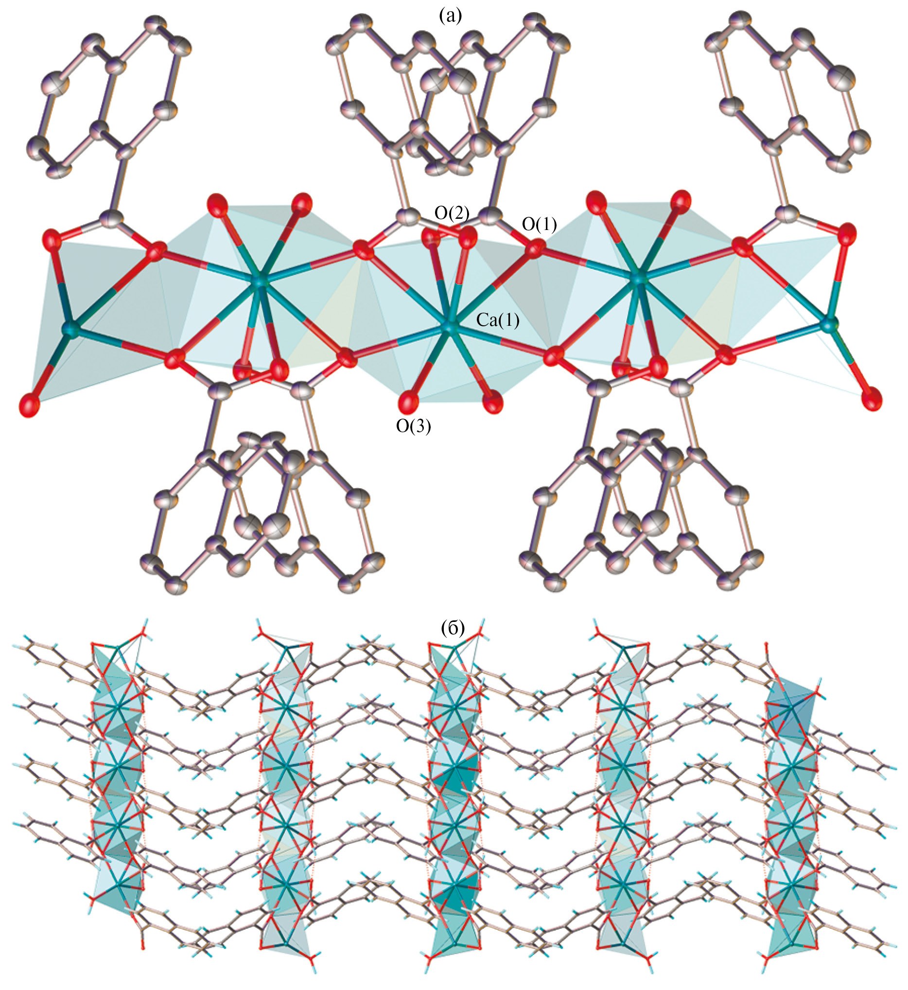 Соединение III кристаллизуется в ромбической группе Pbcn и представляет собой 1D-полимер кальция с хелатно-мостиковыми Naph-анионами и молекулами воды (рис. 3). Каждый атом Ca хелатно координирует два Naph-аниона и две молекулы воды (расстояния Ca–O 2.348(3)–2.587(3) Å), образуя одношапочную тригональную призму (SQ(CaO6) = 3.173). Атомы металла в полимере находятся на расстоянии 3.9701(8) Å и образуют плоскость, а плоскости хелатных циклов CaO2C располагаются под углом 38.8(2)˚ относительно нее. Нафтильные заместители расположены вокруг всей полимерной цепи. Конформация стабилизируется за счет классических H-связей между координированными молекулами воды и атомами кислорода карбоксилат-анионов (табл. 2). В кристалле наблюдается формирование C–H···π-контактов. Упаковка молекул в кристалле определяется наличием ароматических нафталиновых фрагментов, образующих π···π-взаимодействия с аналогичными фрагментами соседней полимерной цепочки (табл. 3).