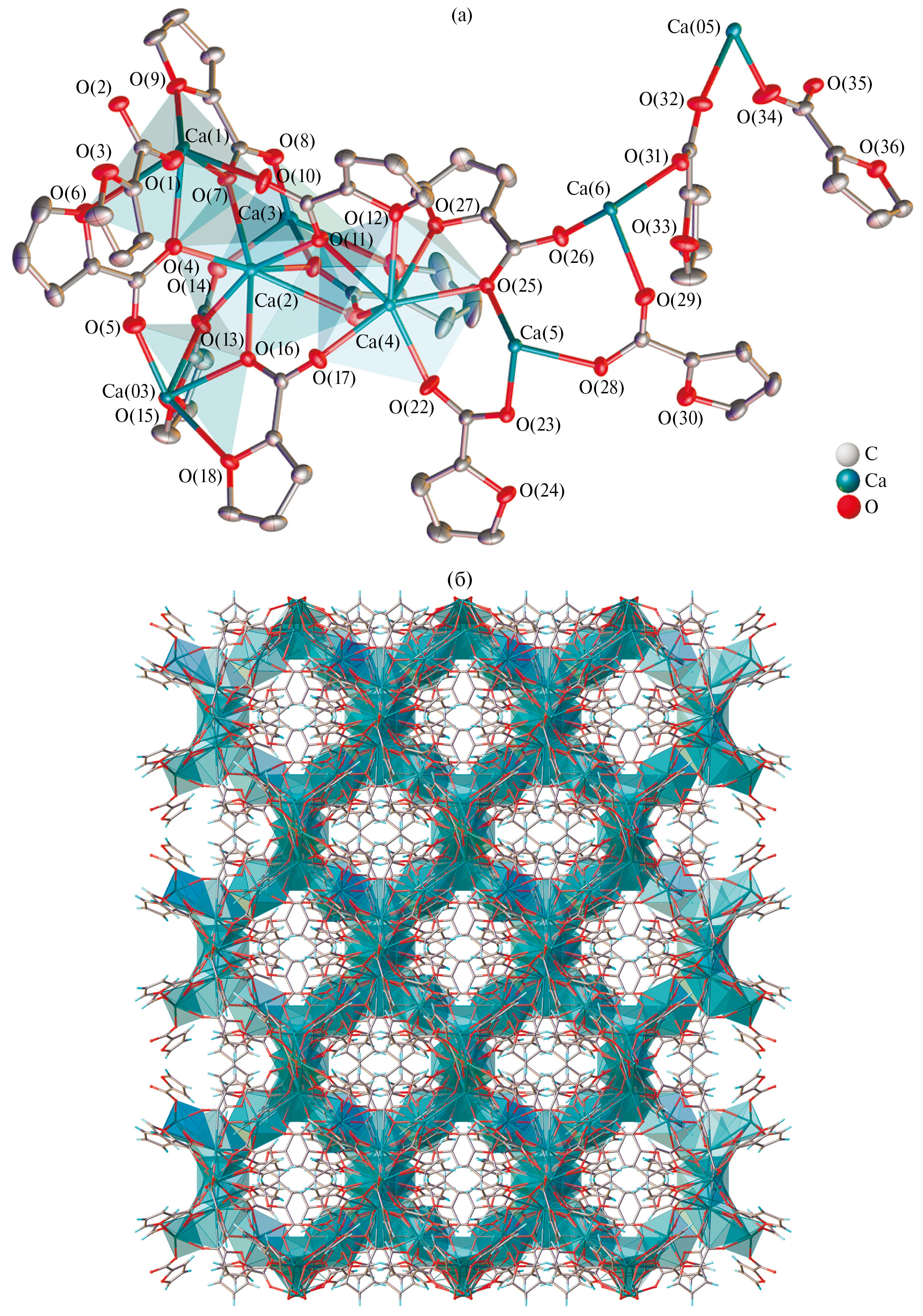 Соединение IV представляет собой 3D-поли-мер кальция с Fur-анионами (рис. 4), кристаллизующийся в моноклинной пространственной группе P21/c. В независимой части элементарной ячейки находится восемь атомов кальция, четыре из которых находятся в частном положении — два в центре инверсии (Ca(3) и Ca(6), оба с заселенностью 0.5) и два на оси второго порядка (Ca(03) и Ca(05), оба с заселенностью 0.5) и 12 Fur-анионов. Наивысшее координационное число 10 реализуется для атома Ca(1), что соответствует полиэдру Sphenocorona (SQ(CaO10) = 1.760). Четыре атома кальция координируют по восемь атомов O (Ca(3), Ca(4), Ca(03) и Ca(05)), образуя различные полиэдры. Полиэдр атома Ca(3) имеет кубическую конфигурацию (SQ(CaO8) = 3.223), полиэдр атома Ca(4) — двушапочная тригональная призма (SQ(CaO8) = 2.324), полиэдры атомов Ca(03) и Ca(05) — квадратные антипризмы (SQ(CaO8) = 0.844 и 1.418 соответственно). Координационное окружение каждого атома Ca состоит из атомов O карбоксилатных групп и атомов O фурановых циклов. Расстояния Ca…O для атомов O фурановых фрагментов (2.6179(12)–3.1200(13) Å) в среднем больше, чем таковые для атомов кислорода карбоксилатных групп (2.3003(11)–2.5820(12) Å). Каждый Fur-анион выступает в качестве полумостикового лиганда за счет µ2,κ1,κ2-координации карбоксилатной группы и хелатирования за счет одновременной координации по фурановому атому кислорода. По всей видимости, последний эффект дополнительно стабилизирует плоские конформации карбоксилат-анионов (углы между плоскостями, образованными фурановым фрагментом и карбоксилатной группой, составляют 55–60°). Кратчайшее расстояние между ионами кальция реализуется между ионами Ca(2) и Ca(03) и составляет 3.8381(3) Å. Кристаллическая решетка 3D-полимера III представляет собой непористую структуру, которая дополнительно стабилизирована нековалентными C–H···O-контактами (табл. 2). Упрощенная сеть структурных единиц в IV из атомов кальция и мостиковых fur-анионов относится к топологическому типу met, 3,6,6T1. По данным TopCryst [60], такая же сеть имеется в структурах микропористых формиатов магния [Mg(HCO2)2] [61], марганца(II) [Mn3(HCO2)6] [62], цинка [Zn3(HCO2)6]n ⋅ nSolv [63] и ацетата марганца(II) [Mn(OAc)2]n [64].