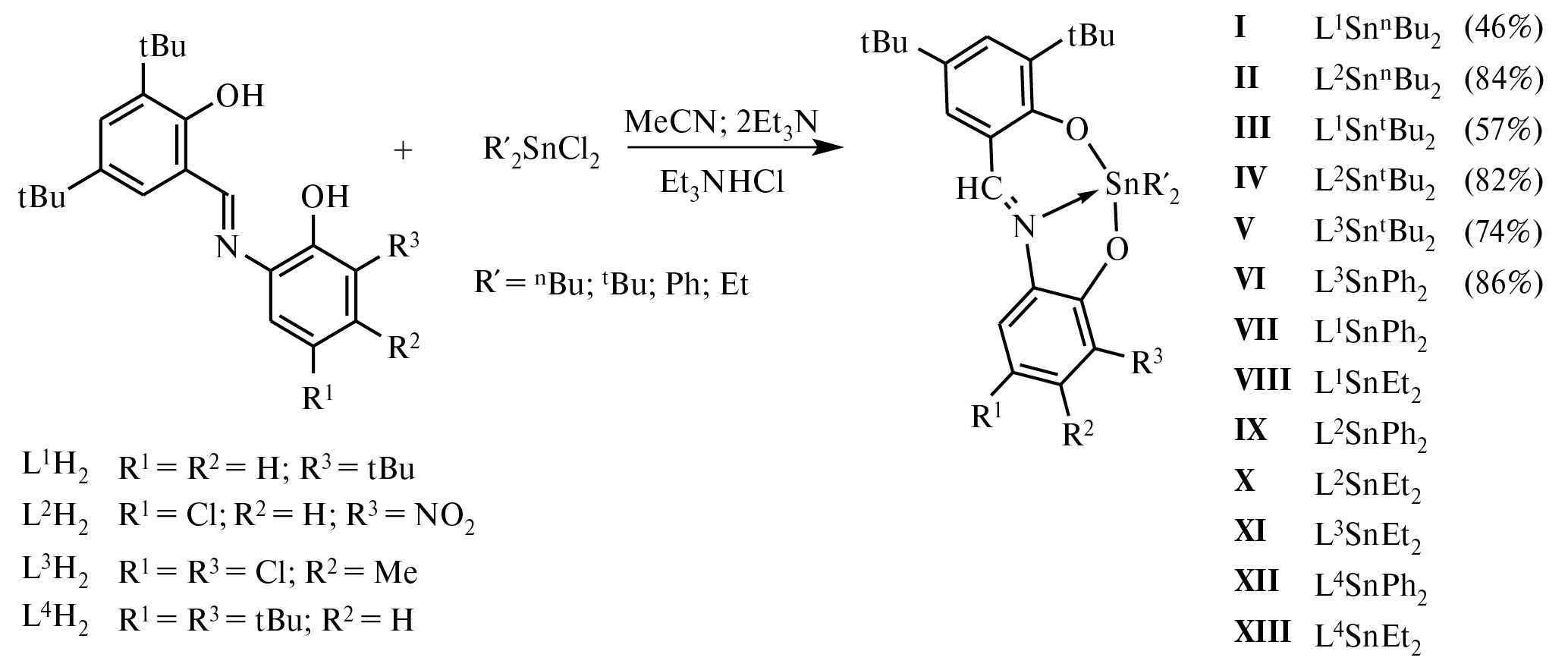 Синтез комплексов олова (L)SnR2 (I–VI) выполняли обменной реакцией между R2SnCl2 (0.3 ммоль) и 1 экв. основания Шиффа (L1H2–L4H2) в ацетонитриле в присутствии 2 экв. триэтиламина по ранее описанной методике [30].