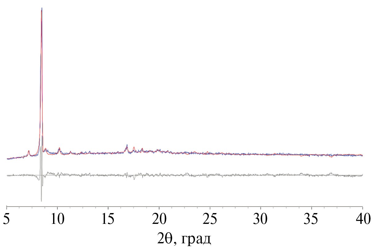 Рис. 1. Теоретическая (красная линия) и экспериментальная (синяя линия) дифрактограммы образца комплекса I и их разность (серая линия).