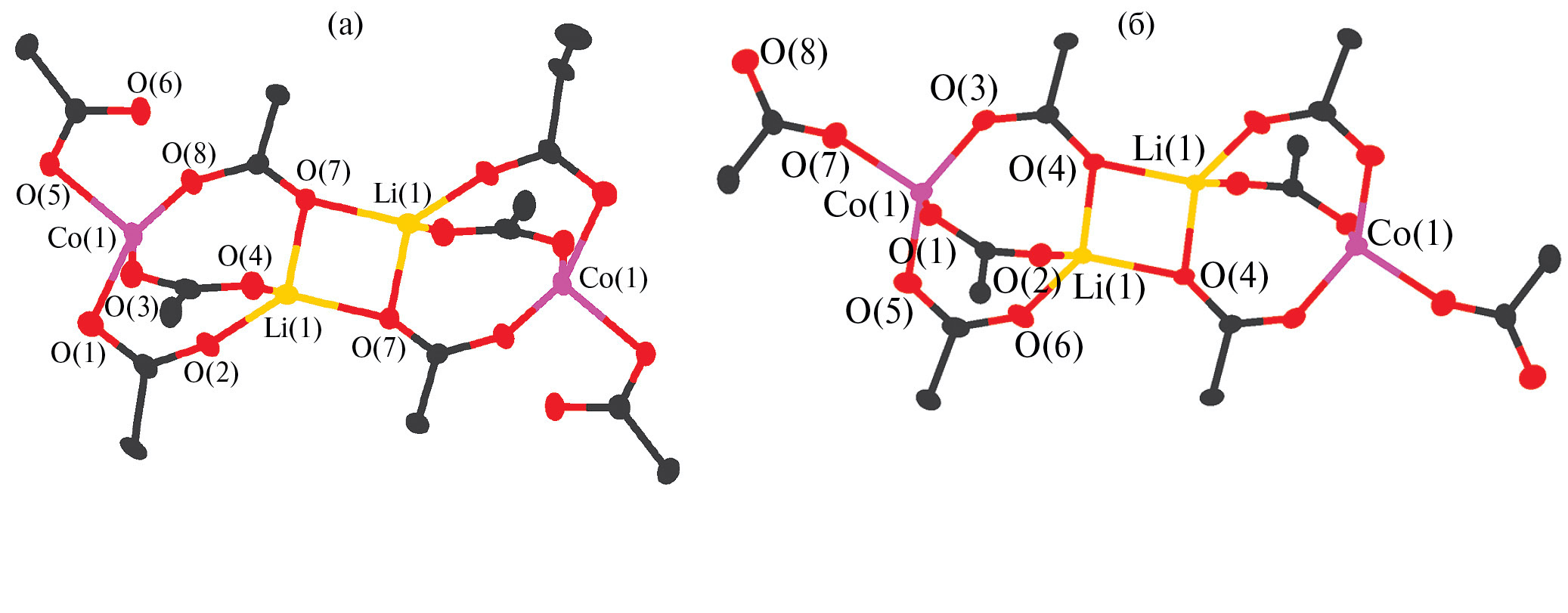 Центральный фрагмент Li2O2 соответствует искаженному квадрату (Li(1)–O(7) 1.938(9), 2.022(10) Å, Li(1) O(7) Li(1) 89.5(4)o, O(7) Li(1) O(7) 90.5(4)o для I; Li(1)–O(4) 1.968(4), 1.979(4) Å, Li(1) O(4) Li(1) 89.77(17)o, O(4) Li(1) O(4) 90.22(17)o для II). Координационное окружение атомов кобальта, окруженных четырьмя атомами карбоксилат-анионов, соответствует искаженному тетраэдру в II (SQ = 0.883) и более искаженному тетраэдру в I (SQ = 2.918). Такое искажение обусловлено ориентацией четвертой монодентатно связанной карбоксилатной группой: в комплексе I ее координация близка к хелатной (рис. 2а; Co(1)…O(6) 2.560 Å, угол Co(1) O(5) O(6) 74.73o), в II она направлена вдоль вектора Li(1) Co(1) O(7) (рис. 2б; Co(1)…O(8) 4.113 Å, угол Co(1) O(5) O(6) 167.27o).