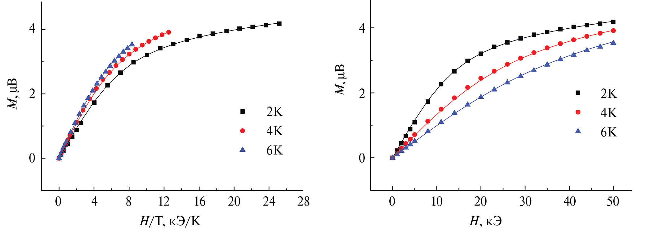 Рис. 6. Зависимости М(H/T) (слева) и M(Н) (справа) при различных температурах для комплекса I. Сплошные линии — теоретические кривые, рассчитанные с помощью программы PHI.