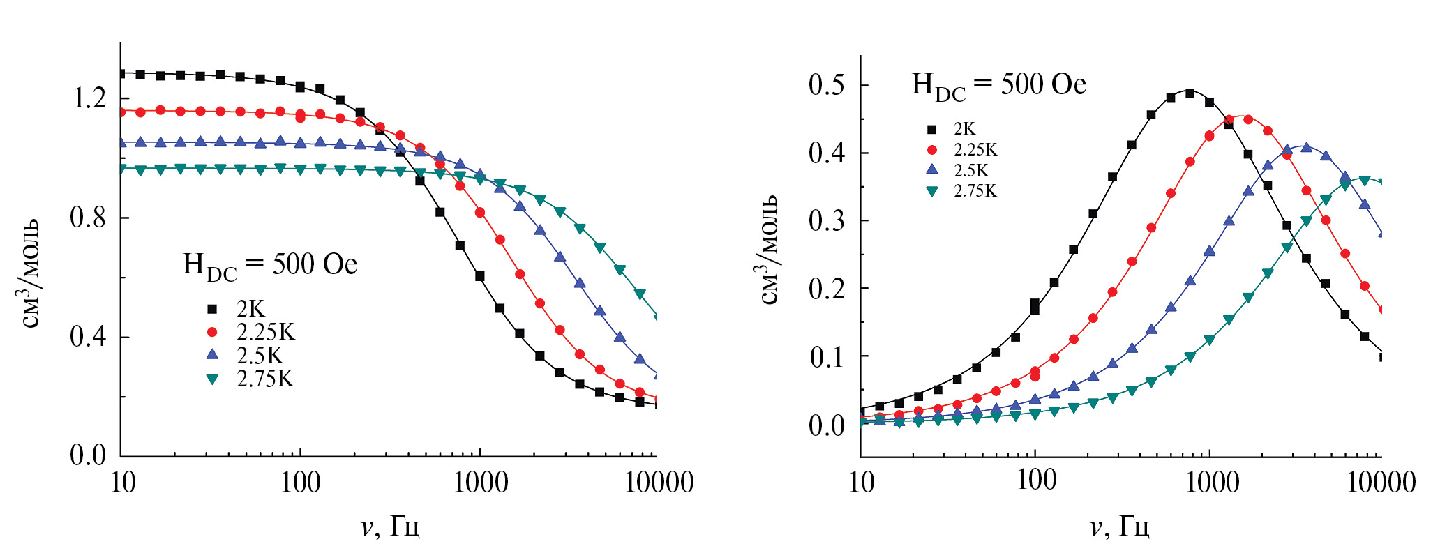 С целью определения наличия у комплекса I медленной магнитной релаксации проводили исследования динамической магнитной восприимчивости. На частотных зависимостях мнимой компоненты динамической магнитной восприимчивости χʹʹ(ν) комплекса I в нулевом магнитном поле обнаружены сигналы пренебрежимо малые по сравнению с действительной компонентной. Наложение постоянного магнитного поля HDC приводит к появлению значимых сигналов на зависимостях χʹʹ(ν), что указывает на наличие вклада в релаксацию эффекта квантового туннелирования намагниченности (КТН). Варьирование величины HDC позволило определить оптимальное значение (500 Э), при наложении которого максимумы на соответствующих зависимостях χʹʹ(ν) расположены при наименьших значениях частоты, что соответствует наибольшим временам релаксации.