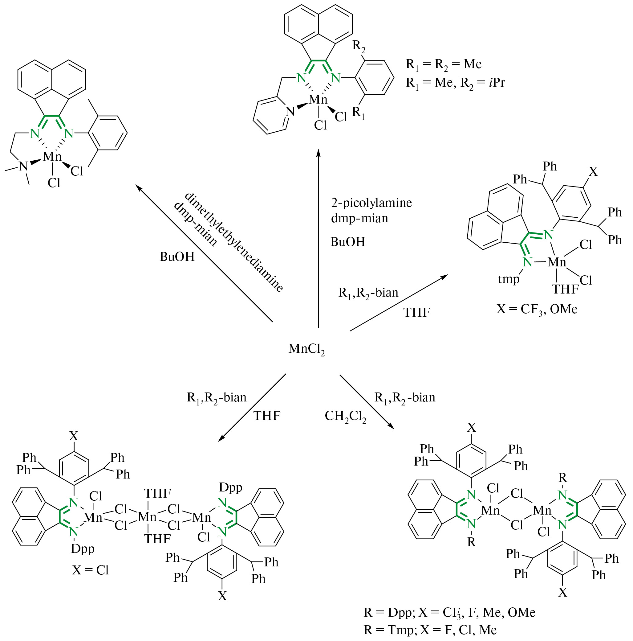 Несмотря на хорошо разработанную координационную химию BIAN в отношении многих переходных и непереходных металлов, сведения о комплексах марганца с BIAN фрагментарны. Сообщается о получении серии квадратно-пирамидальных комплексов Mn(II) общего вида [Mn(R1,R2-bian)Cl2] (схема 1), содержащих несимметричные лиганды BIAN с дополнительным N-донорным центром, обеспечивающим тридентатно-циклический способ координации [26]. Несимметричные BIAN также использовались для синтеза моно-, би- и трехъядерных комплексов: [Mn(R1,R2-bian)(THF)Cl2], [Mn(R1,R2-bian)Cl2]2 и [Mn(R1, R2-bian)Cl2]2{Mn(THF)2} (схема 1), в которых один из атомов азота BIAN связан со стерически затрудненной 2,6-дибензгидрилфенильной группой [27].