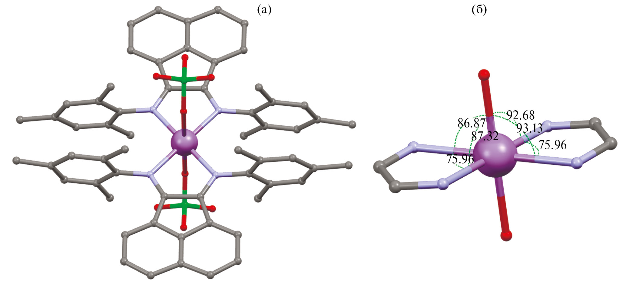 Синтез [Mn(Tmp-bian)2(ClO4)2] (III). Mn(ClO4)2 · · 6H2O (320 мг, 884 мкмоль) и Tmp-bian (736 мг, 1768 мкмоль) растворяли в 20 мл CH3CN с получением оранжево-желтого раствора. При перемешивании смеси при комнатной температуре в течение 4 ч раствор приобретал темно-коричневую окраску. Затем раствор упаривали в вакууме до минимального объема, что приводило к выпадению осадка. Осадок отфильтровывали на фильтре Шотта (пористость 16) и промывали последовательно этанолом, холодным диэтиловым эфиром и холодным этилацетатом. Монокристаллы III · 2C7H8, пригодные для рентгеноструктурного анализа, получали наслаиванием гексана на раствор комплекса в толуоле. Выход 471 мг (49%).