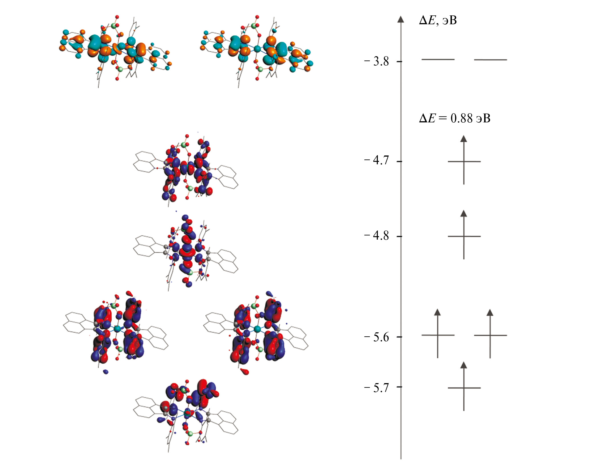 Для установления электронной структуры комплексов I и III выполнялись квантово-химические расчеты в рамках DFT. Полученные рентгеноструктурные данные использовались в качестве исходных моделей для дальнейшей оптимизации. C использованием неограниченного (unrestricted) метода расчетов были рассчитаны уровни энергии и формы граничных молекулярных орбиталей основного состояния молекул с пятью неспаренными электронами (pис. 3 и 4, табл. 3). Отсутствие мнимых частот указывало на нахождение системы в локальном минимуме на поверхности потенциальной энергии.