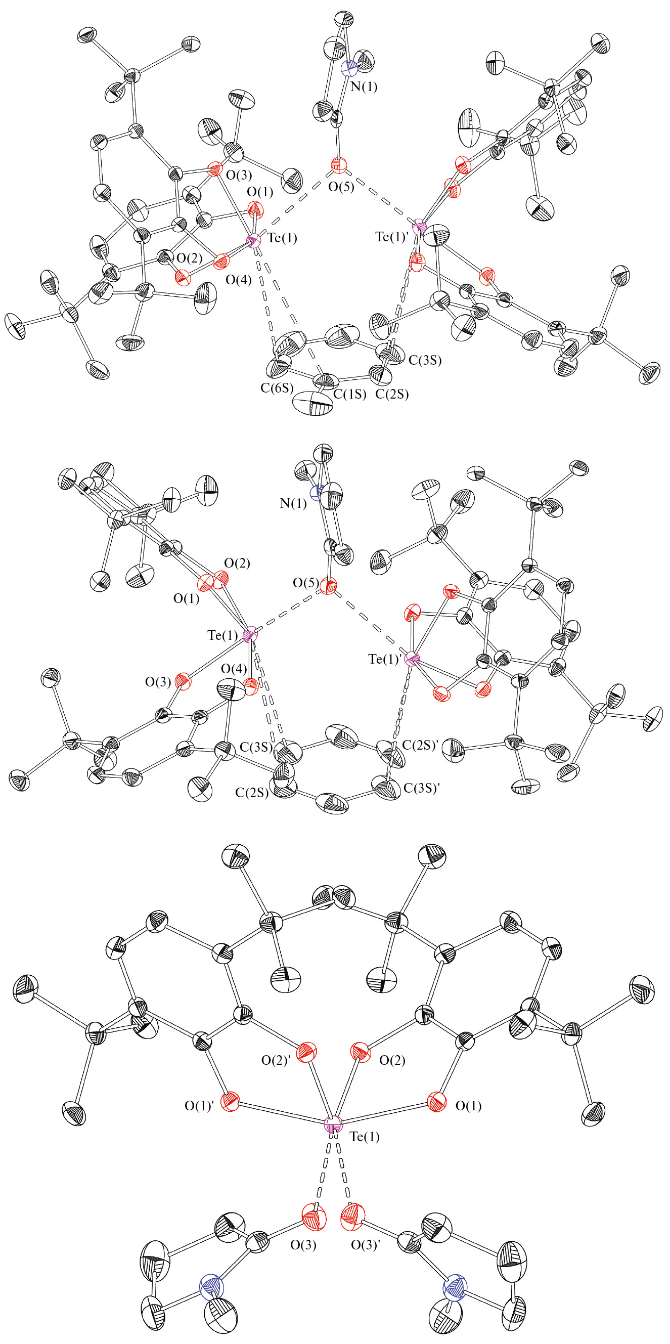 Таким образом, получены и охарактеризованы методами РСА и спектроскопии ЯМР аддукты стерически затрудненного бис(3,6-ди-трет-бутил)катехолата теллура(IV) с N-метилпирролидоном. Установлено, что ароматические углеводороды (бензол и толуол) входят в состав комплексов за счет слабых взаимодействий атома Te с π-системой арена. Отметим, что комплексы теллура могут быть потенциально интересными предшественниками систем разделения ароматических и алифатических углеводородов, в том числе промышленно важной смеси бензол–циклогексан.