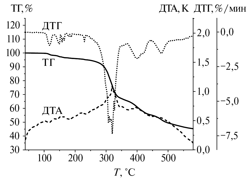 Рис. 1. Кривые ТГ, ДТА и ДТГ для комплекса I