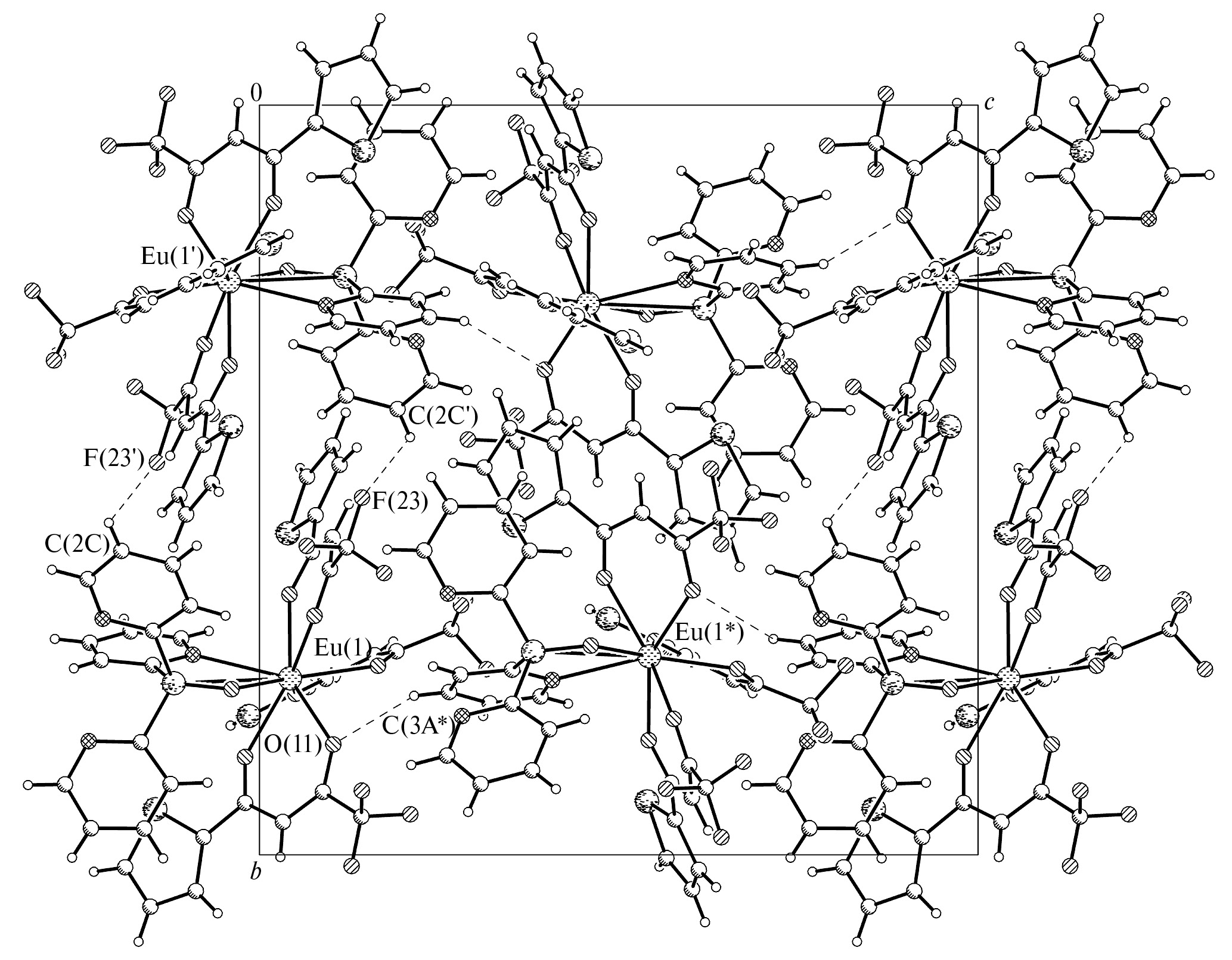 В кристаллической структуре II между соседними молекулами комплекса имеются короткие контакты С−Н…О (3.167 Å) в плоскости ас (рис. 3). Молекулы Me2CO также образуют слабые взаимодействия С−Н…О с молекулами комплекса. Расстояние между ближайшими атомами Eu составляет 8.424 Å.