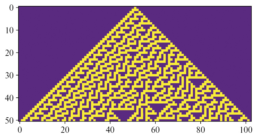 Действие клеточного автомата с кодом Вольфрама W=30 и с начальным состоянием s0= =( s 0 0 ,, s 102 0 ) MathType@MTEF@5@5@+= feaahqart1ev3aaatCvAUfeBSjuyZL2yd9gzLbvyNv2Caerbov2D09 MBdbqedmvETj2BSbqefm0B1jxALjhiov2DamXvP5Mu1n3CPfMBaeHb tngAV9gBc92BRnearqqtubsr4rNCHbGeaGqik81rpu0dbbf9q8WrFf euY=Hhbbf9v8qqaqFr0xc9pk0xbba9q8WqFL0dir=xcvk9FHe9v8qq aq=dir=f0=yqaqVeLsFr0=vr0=vr0db8meaabaqaciaacaGaaeqaba WaaqGafaaakeaacaaI9aGaaGikaiaadohadaqhaaWcbaGaaGimaaqa aiaaicdaaaGccaaISaGaeSOjGSKaaGilaiaadohadaqhaaWcbaGaaG ymaiaaicdacaaIYaaabaGaaGimaaaakiaaiMcaaaa@4953@ , где s 52 0 =1 MathType@MTEF@5@5@+= feaahqart1ev3aaatCvAUfeBSjuyZL2yd9gzLbvyNv2Caerbov2D09 MBdbqedmvETj2BSbqefm0B1jxALjhiov2DamXvP5Mu1n3CPfMBaeHb tngAV9gBc92BRnearqqtubsr4rNCHbGeaGqik81rpu0dbbf9q8WrFf euY=Hhbbf9v8qqaqFr0xc9pk0xbba9q8WqFL0dir=xcvk9FHe9v8qq aq=dir=f0=yqaqVeLsFr0=vr0=vr0db8meaabaqaciaacaGaaeqaba WaaqGafaaakeaacaWGZbWaa0baaSqaaiaaiwdacaaIYaaabaGaaGim aaaakiaai2dacaaIXaaaaa@42C2@ , s i 0 =0 MathType@MTEF@5@5@+= feaahqart1ev3aaatCvAUfeBSjuyZL2yd9gzLbvyNv2Caerbov2D09 MBdbqedmvETj2BSbqefm0B1jxALjhiov2DamXvP5Mu1n3CPfMBaeHb tngAV9gBc92BRnearqqtubsr4rNCHbGeaGqik81rpu0dbbf9q8WrFf euY=Hhbbf9v8qqaqFr0xc9pk0xbba9q8WqFL0dir=xcvk9FHe9v8qq aq=dir=f0=yqaqVeLsFr0=vr0=vr0db8meaabaqaciaacaGaaeqaba WaaqGafaaakeaacaWGZbWaa0baaSqaaiaadMgaaeaacaaIWaaaaOGa aGypaiaaicdaaaa@4234@  при i 52 изображено на рис. 2.