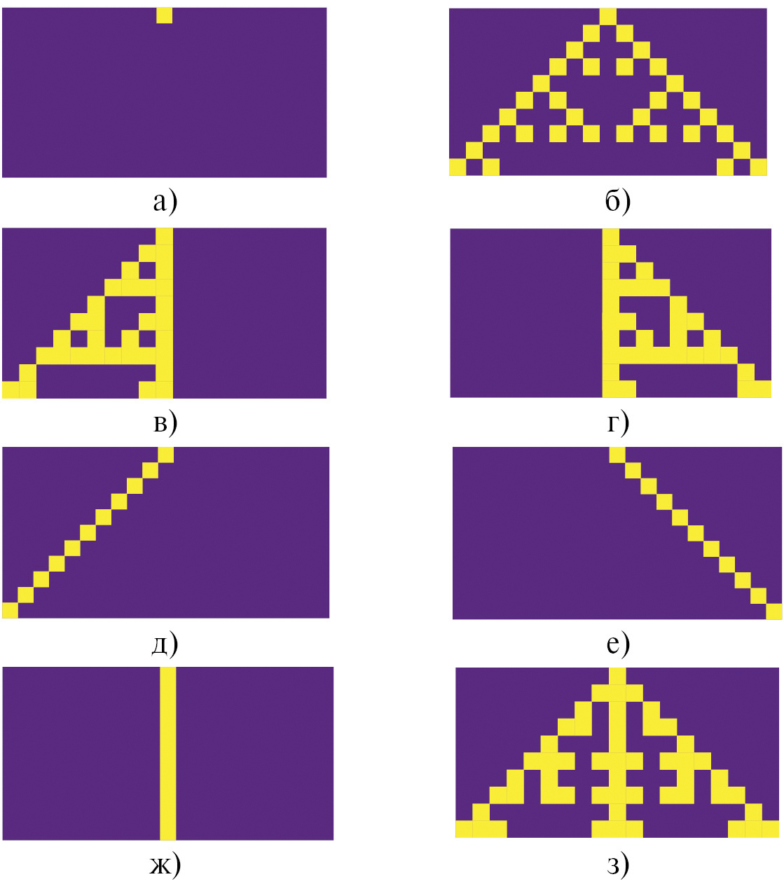 Правило клеточного автомата r = (0,1,1,1,1,1,1,1) с кодом Вольфрама W=254 изображено на рис. 1, где темные клетки — нули, а светлые — единицы. В каждой Т-образной фигуре, соответствующей определенному виду окрестности, верхний ряд клеток — s i1 k1 MathType@MTEF@5@5@+= feaahqart1ev3aaatCvAUfeBSjuyZL2yd9gzLbvyNv2Caerbov2D09 MBdbqedmvETj2BSbqefm0B1jxALjhiov2DamXvP5Mu1n3CPfMBaeHb tngAV9gBc92BRnearqqtubsr4rNCHbGeaGqik81rpu0dbbf9q8WrFf euY=Hhbbf9v8qqaqFr0xc9pk0xbba9q8WqFL0dir=xcvk9FHe9v8qq aq=dir=f0=yqaqVeLsFr0=vr0=vr0db8meaabaqaciaacaGaaeqaba WaaqGafaaakeaacaWGZbWaa0baaSqaaiaadMgacqGHsislcaaIXaaa baGaam4AaiabgkHiTiaaigdaaaaaaa@442F@ , s i k1 MathType@MTEF@5@5@+= feaahqart1ev3aaatCvAUfeBSjuyZL2yd9gzLbvyNv2Caerbov2D09 MBdbqedmvETj2BSbqefm0B1jxALjhiov2DamXvP5Mu1n3CPfMBaeHb tngAV9gBc92BRnearqqtubsr4rNCHbGeaGqik81rpu0dbbf9q8WrFf euY=Hhbbf9v8qqaqFr0xc9pk0xbba9q8WqFL0dir=xcvk9FHe9v8qq aq=dir=f0=yqaqVeLsFr0=vr0=vr0db8meaabaqaciaacaGaaeqaba WaaqGafaaakeaacaWGZbWaa0baaSqaaiaadMgaaeaacaWGRbGaeyOe I0IaaGymaaaaaaa@4287@ , s i+1 k1 MathType@MTEF@5@5@+= feaahqart1ev3aaatCvAUfeBSjuyZL2yd9gzLbvyNv2Caerbov2D09 MBdbqedmvETj2BSbqefm0B1jxALjhiov2DamXvP5Mu1n3CPfMBaeHb tngAV9gBc92BRnearqqtubsr4rNCHbGeaGqik81rpu0dbbf9q8WrFf euY=Hhbbf9v8qqaqFr0xc9pk0xbba9q8WqFL0dir=xcvk9FHe9v8qq aq=dir=f0=yqaqVeLsFr0=vr0=vr0db8meaabaqaciaacaGaaeqaba WaaqGafaaakeaacaWGZbWaa0baaSqaaiaadMgacqGHRaWkcaaIXaaa baGaam4AaiabgkHiTiaaigdaaaaaaa@4424@ , нижняя клетка — s i k MathType@MTEF@5@5@+= feaahqart1ev3aaatCvAUfeBSjuyZL2yd9gzLbvyNv2Caerbov2D09 MBdbqedmvETj2BSbqefm0B1jxALjhiov2DamXvP5Mu1n3CPfMBaeHb tngAV9gBc92BRnearqqtubsr4rNCHbGeaGqik81rpu0dbbf9q8WrFf euY=Hhbbf9v8qqaqFr0xc9pk0xbba9q8WqFL0dir=xcvk9FHe9v8qq aq=dir=f0=yqaqVeLsFr0=vr0=vr0db8meaabaqaciaacaGaaeqaba WaaqGafaaakeaacaWGZbWaa0baaSqaaiaadMgaaeaacaWGRbaaaaaa @40DF@ .