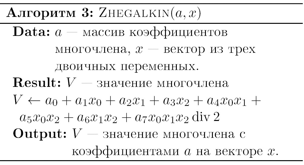 определитель которой равен 1. Решая систему (3) для заданных правых частей (rj), j =0,…,7, найдем коэффициенты многочлена Жегалкина d.