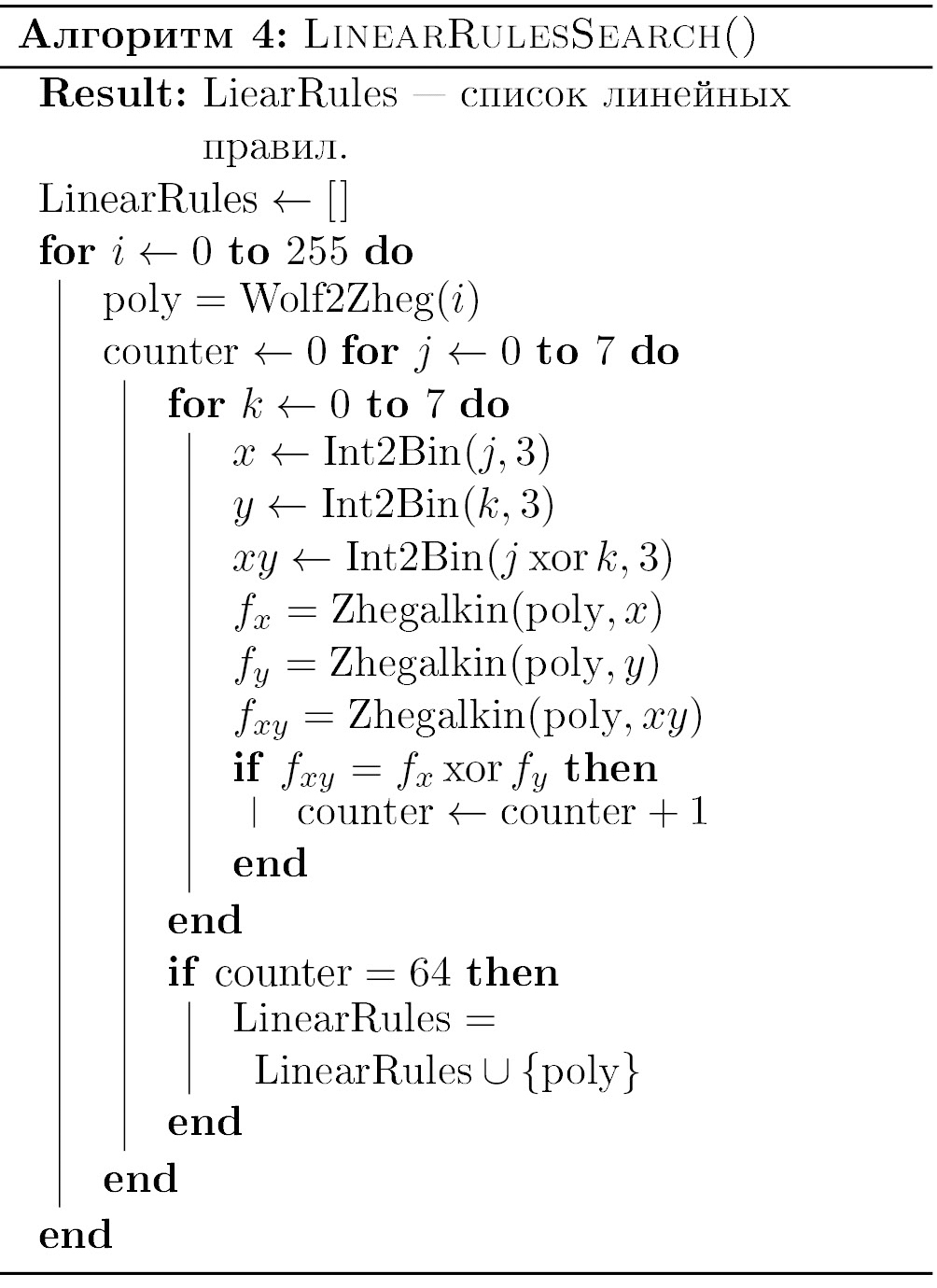 Приведем краткое описание алгоритмов. Алгоритм 7 преобразует десятичное число в двоичный код. Алгоритм 8 по коду Вольфрама, т.е. десятичному номеру правила клеточного автомата, строит многочлен Жегалкина. Алгоритм 9 вычисляет значение многочлена Жегалкина на векторе x. Алгоритм 10 реализует перебор всех построенных многочленов Жегалкина на трехклеточных шаблонах и выбор тех из них, которые индуцируют линейный оператор Жегалкина согласно определению 4.