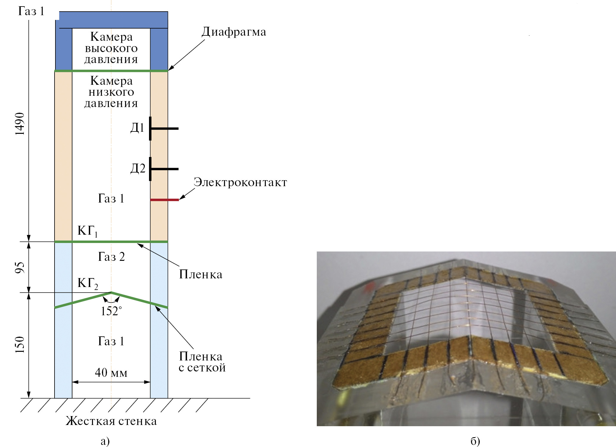 Эксперименты проводились на ударной трубе в РФЯЦ-ВНИИЭФ (рис. 1). Техника эксперимента и диагностические методики подробно описаны в предыдущих сходных работах [9, 15, 16]. Ударная труба имеет сечение внутреннего канала 40×40 мм, состоит из камеры высокого давления (драйвера), камеры низкого давления и измерительной секции, состоящей из двух оптически прозрачных отсеков, между которыми в ряде опытов устанавливалась 3D- или 2D-сетка из медной проволочки или из полихлорвиниловых нитей. Контактная граница, на которую накладывалась сетка (КГ2), имела угол излома 152°. На сетку накладывалась тонкая (34 мкм) полимерная пленка. Размер ячейки 3D-сетки составлял 5×5 мм, толщина медных проволочек — 0,1 мм, толщина нитей ПВХ — 0,06 мм. В 2D-сетке поперечный ряд проволочек отсутствовал, расстояние между проволочками составляло 5 мм.
