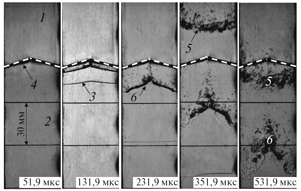 На рис. 2 и 3 представлены кинограммы некоторых экспериментов. На кинограммах М – число Маха падающей на КГ1 ударной волны.