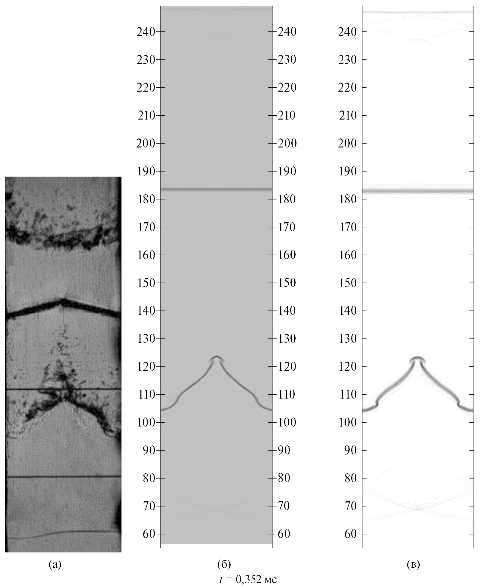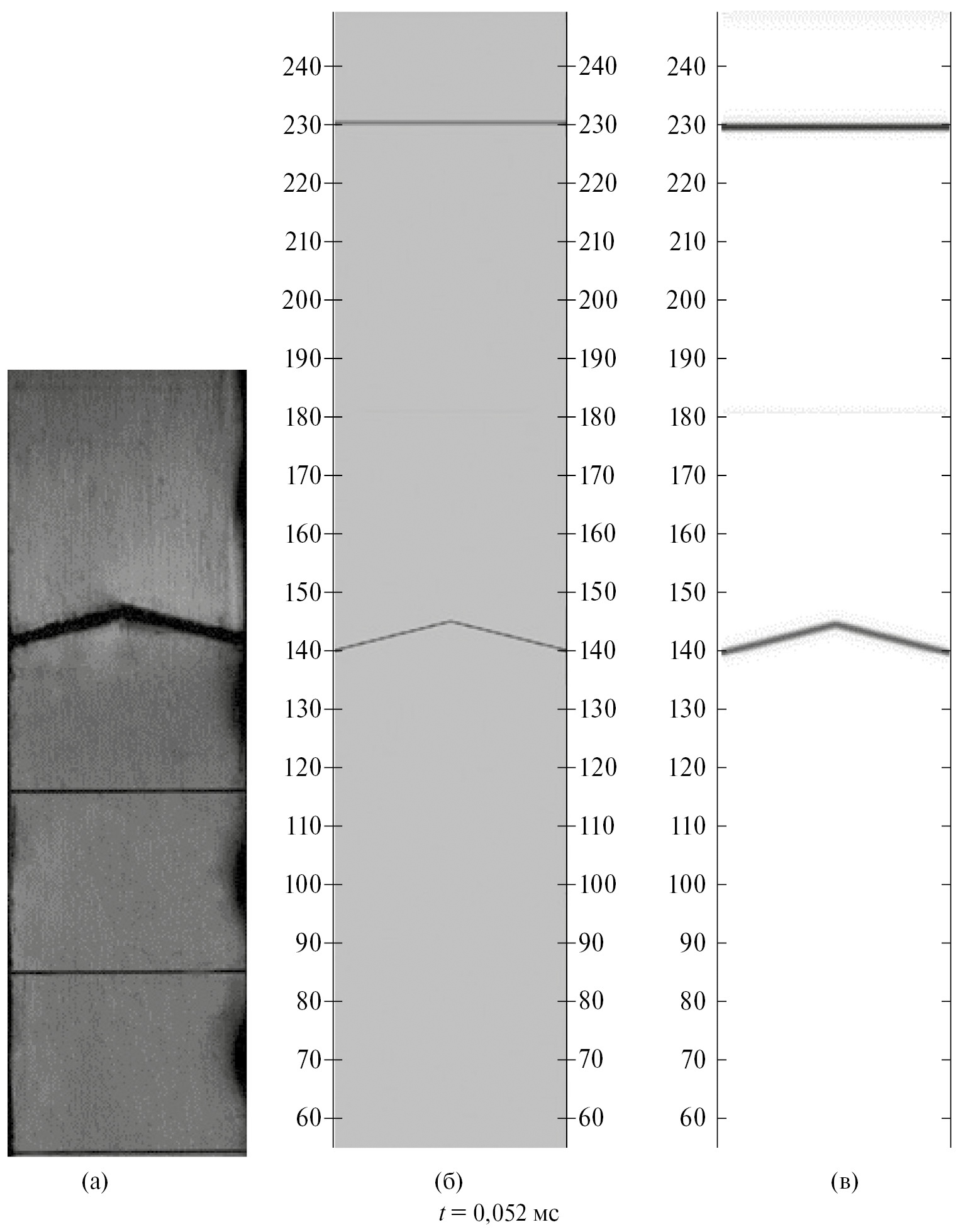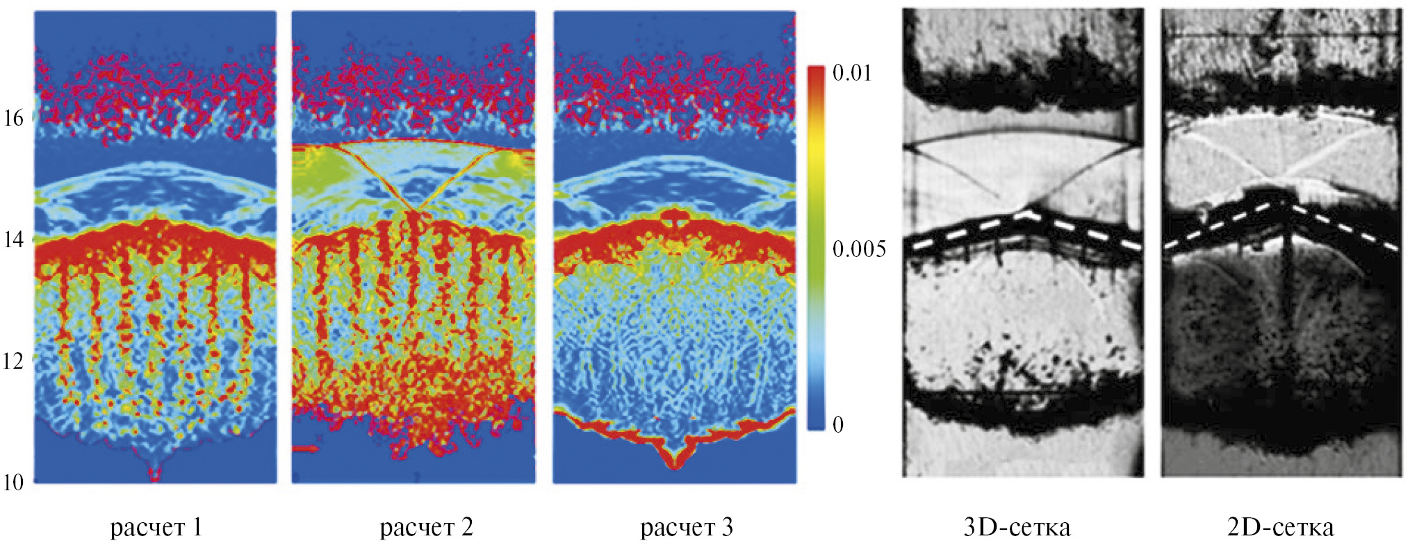Математическое моделирование опыта №1 выполнялось в 2D-постановке по методике МИМОЗА с использованием уравнений Эйлера без привлечения каких-либо моделей учета ТП (ILES моделирование). Расчетная методика основана на лагранжево-эйлеровой стратегии и выделении веществ концентрациями (подробнее см. [41–44]). Такой подход является эффективным при моделировании задач механики сплошной среды с большими деформациями.