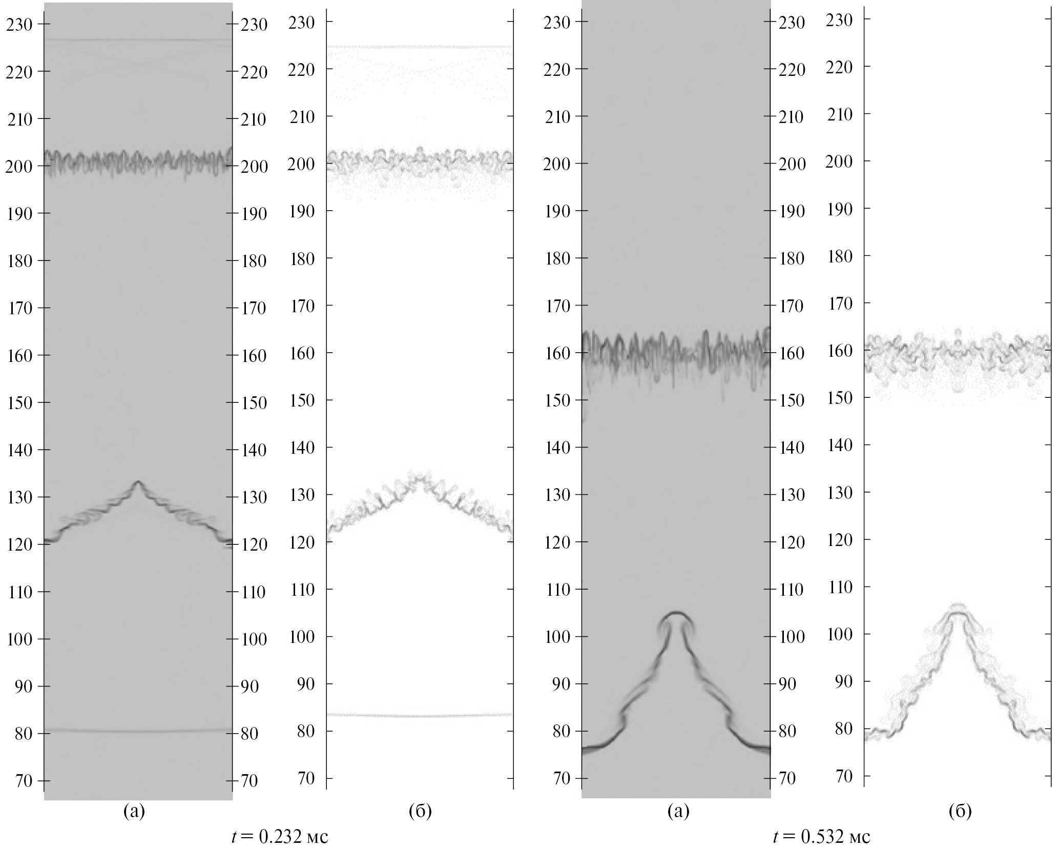 где Фурье-коэффициенты amn,…,dmn, выбираются случайным образом на основе нормального распределения, а затем нормируются для получения желаемого среднеквадратичного отклонения амплитуды, S — нормировочный множитель. Волновые векторы определяются выражениями kxm=2πm/Lx и kyn= =2πn/Ly, Lx и Ly — поперечные размеры ударной трубы. Суммирование в (1) проводится по допустимому диапазону длин волн, которым будут соответствовать определенные пары волновых чисел m и n. Посредством варьирования спектра начальных возмущений возможно добиться лучшего согласия между численными и экспериментальными данными. Численные расчеты для выбранного опыта были выполнены как в присутствии начальных возмущений на контактных границах, так и без них.