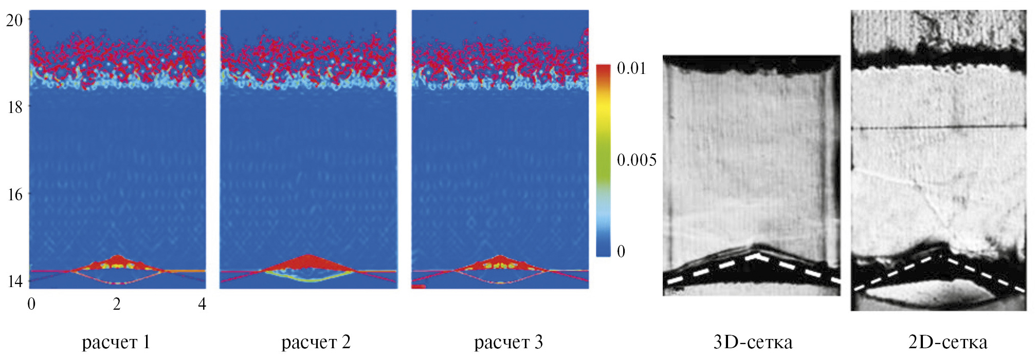 Однако имеются и более существенные отличия расчетов от экспериментов. Во всех расчетах есть небольшое отставание ударной волны, приходящей на место расположения проволочной сетки (рис. 7), по сравнению с экспериментальными данными, на рис. 9 видно, что расчетная ударная волна опережает экспериментальную. Наиболее согласующиеся с экспериментом данные получены в расчете 2 с учетом фрагментов пленки. В частности, на рис. 9 в расчете 2 отраженная от пленки волна (которая распространяется вверх по трубе) заметно ближе к экспериментальному положению. Еще более заметно, что в расчете 2 ЗТП на границе воздух–SF6 согласуется с экспериментальными данными, в то время как в расчете 1 она практически отсутствует, а имеются лишь завитушки вследствие проявления сдвиговой неустойчивости, а в расчете 3 ЗТП имеется, однако она значительно тоньше. Таким образом, пленка играет важную роль в данном течении и для корректного численного моделирования необходимо ее учитывать.