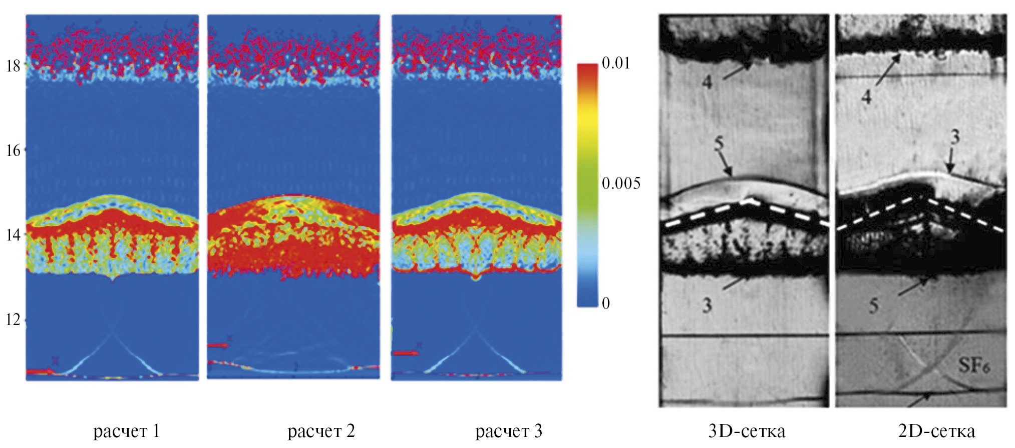 Отметим некоторые различия, имеющиеся в экспериментальных данных. Имеется некоторое опережение движения волн в эксперименте с 2D-сеткой. На рис. 7 видно, что ударная волна пришла на сетку на более раннее время по сравнению с 3D-сеткой. Такое небольшое отличие может быть следствием изменения сетки или же это вследствие экспериментальной погрешности в определении скорости ударной волны, движущейся по ударной трубе. Как бы там ни было, в этой ситуации от расчетов правомерно ожидать качественного согласия с экспериментальными данными, не претендуя на большую точность по времени. Кроме того, имеются отличия в интенсивности перемешивания и скорости распространения ЗТП вдоль трубы, что хорошо видно на рис. 10.