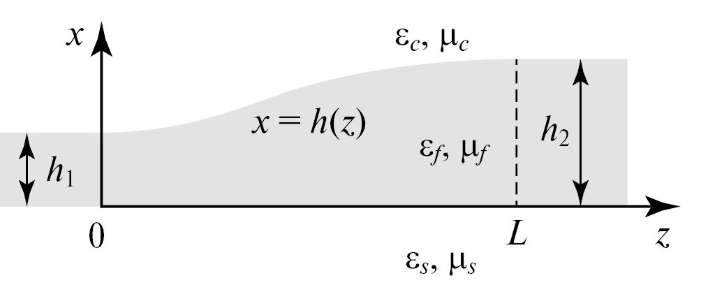 Рассматривается трехслойный плавно-нерегулярный волновод, геометрия которого представлена на рис. 1.