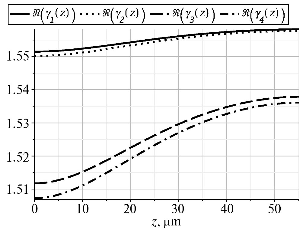 Рис. 2. Величины ℜ(γj(z)), j = 1..4 для z ∈ [0,L].