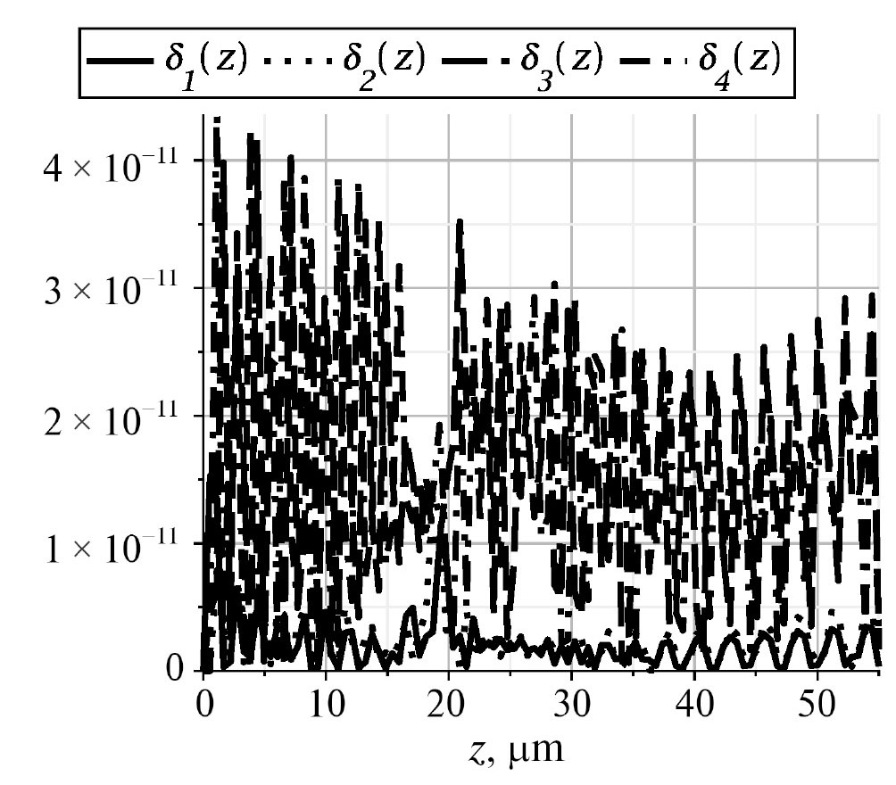 Рис. 5. Невязки δj(z), j = 1..4 для z ∈ [0,L] при значениях abserr и relerr, равных 10–12.