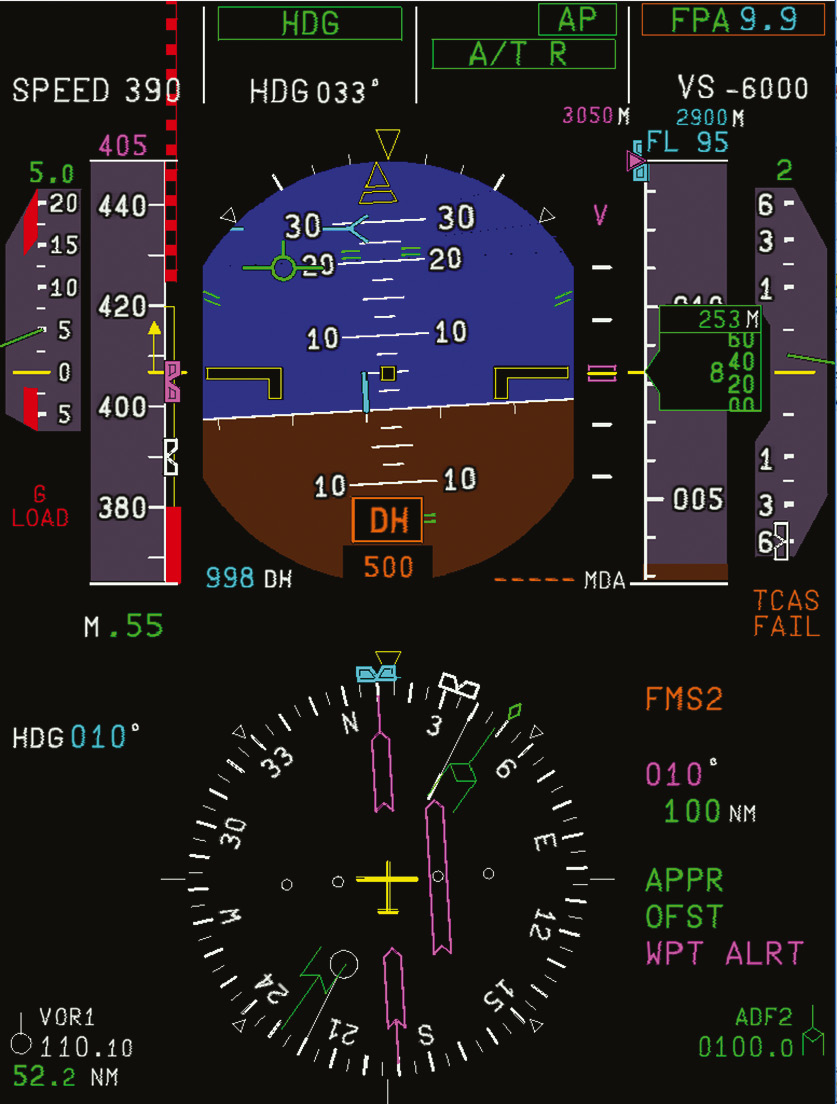 При разработке кабин современных самолетов существует тенденция использовать большие дисплеи. Эта концепция называется “стеклянная кабина”. На один дисплей можно выводить различную информацию о полетной навигации и состоянии оборудования самолета. На рис. 1 показана приборная панель MC-21, разработанная в соответствии с этой концепцией.