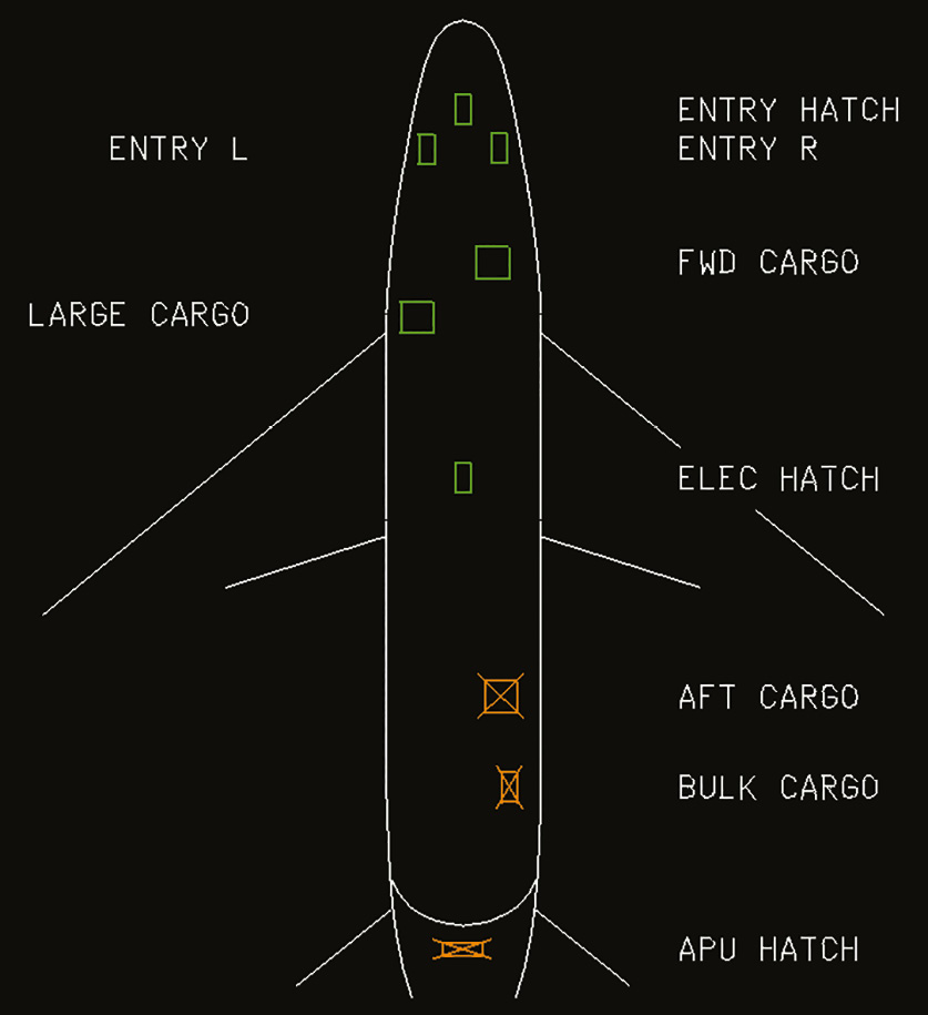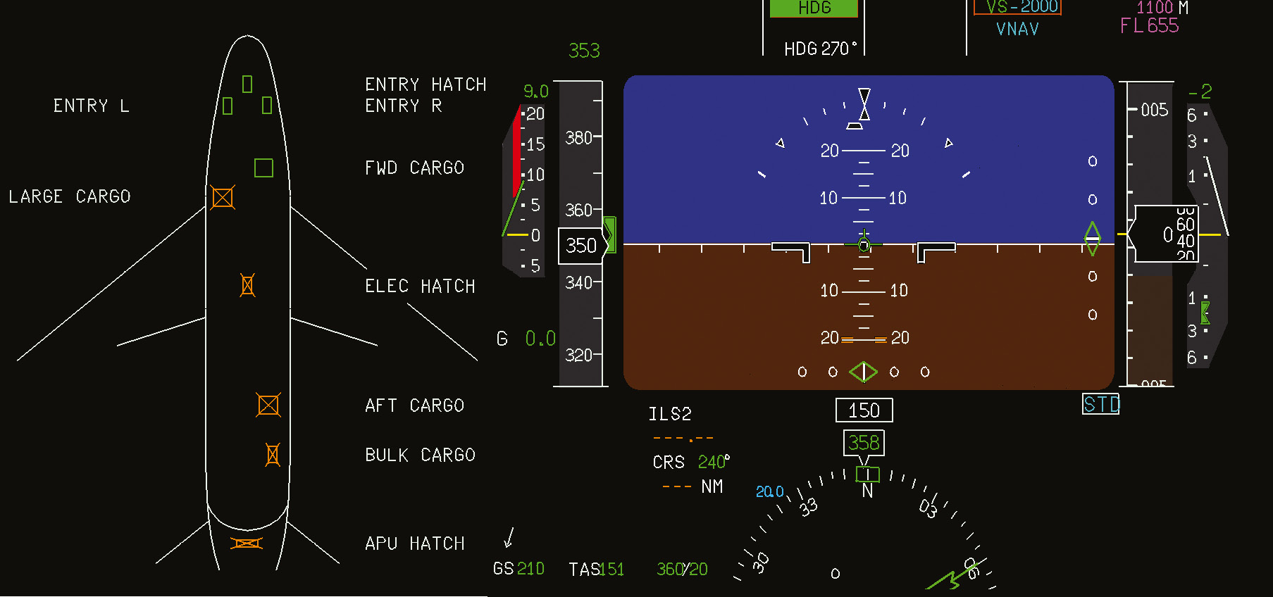При разработке графической компоненты бортовой ОСРВ важно понимать, с какими данными она работает и какие требования предъявляются к ней. Визуализируемые приложения – это не произвольные виртуальные сцены, а типовые приложения, используемые в авиации. Главным из них является Primary flight display (PFD). На рис. 3 приведен PFD для Sukhoi Superjet 100, а на рис. 4 – для МС-21. Примером других приложений может быть индикатор состояния дверей Doors (рис. 5).