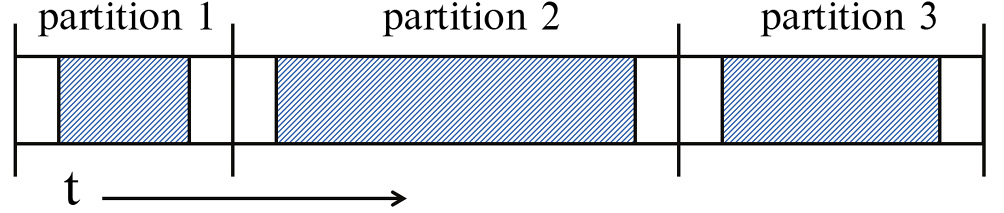 Рис. 8. Расписание выполнения разделов в ОСРВ. Закрашенные прямоугольники соответствуют полезному времени выполнения приложения, пустые прямоугольники в начале и конце каждого раздела – сохранение и восстановление кэшей и регистров