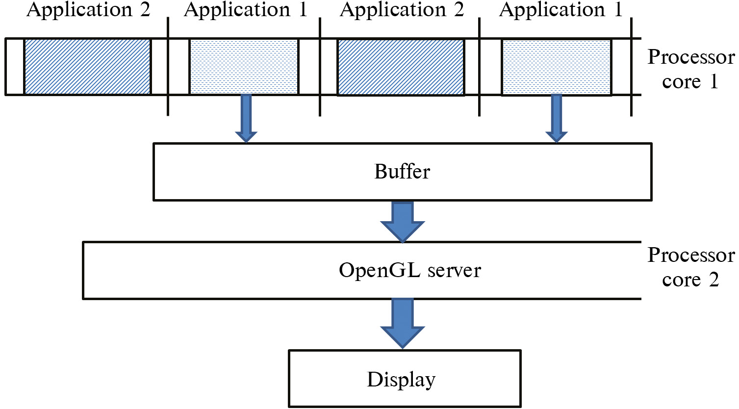 Мы реализовали драйвер OpenGL общего вида, который работает на отдельном ядре процессора и обрабатывает команды OpenGL, поступающие из графических приложений, которые работают на других ядрах процессора. Подход обеспечивает определенное распараллеливание работы графического приложения. Часть работы (подготовка данных и команд) происходит на одном ядре процессора, а другая часть (сервер OpenGL) – на другом ядре процессора и на GPU. Пока данный кадр визуализируется на GPU, раздел на другом ядре может подготавливать данные и команды для следующего кадра.