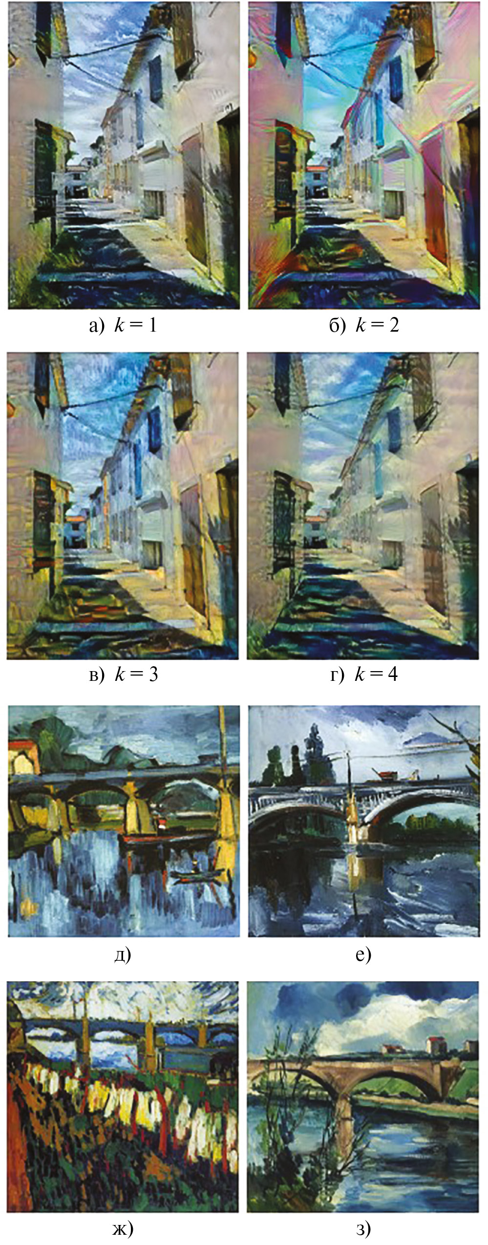 Рис. 5. Работа предложенным алгоритмом стилизации по группе найденных стилей при различном размере группы k: a) стилизация по д), k = 1; б) стилизация по д) и е), k = 2; в) стилизация по д) – ж), k = 3; г) стилизация по д) – з), k = 4