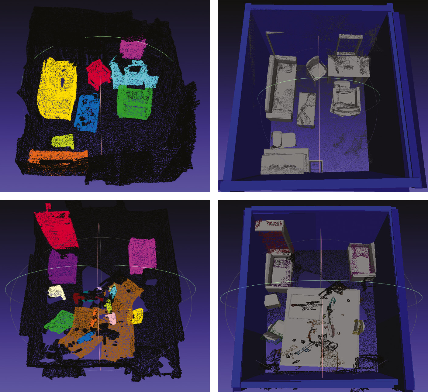 Рис. 6. Сегментированные облака точек и восстановленные 3D-модели сцен
