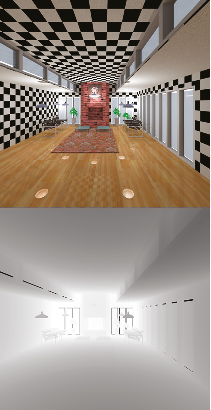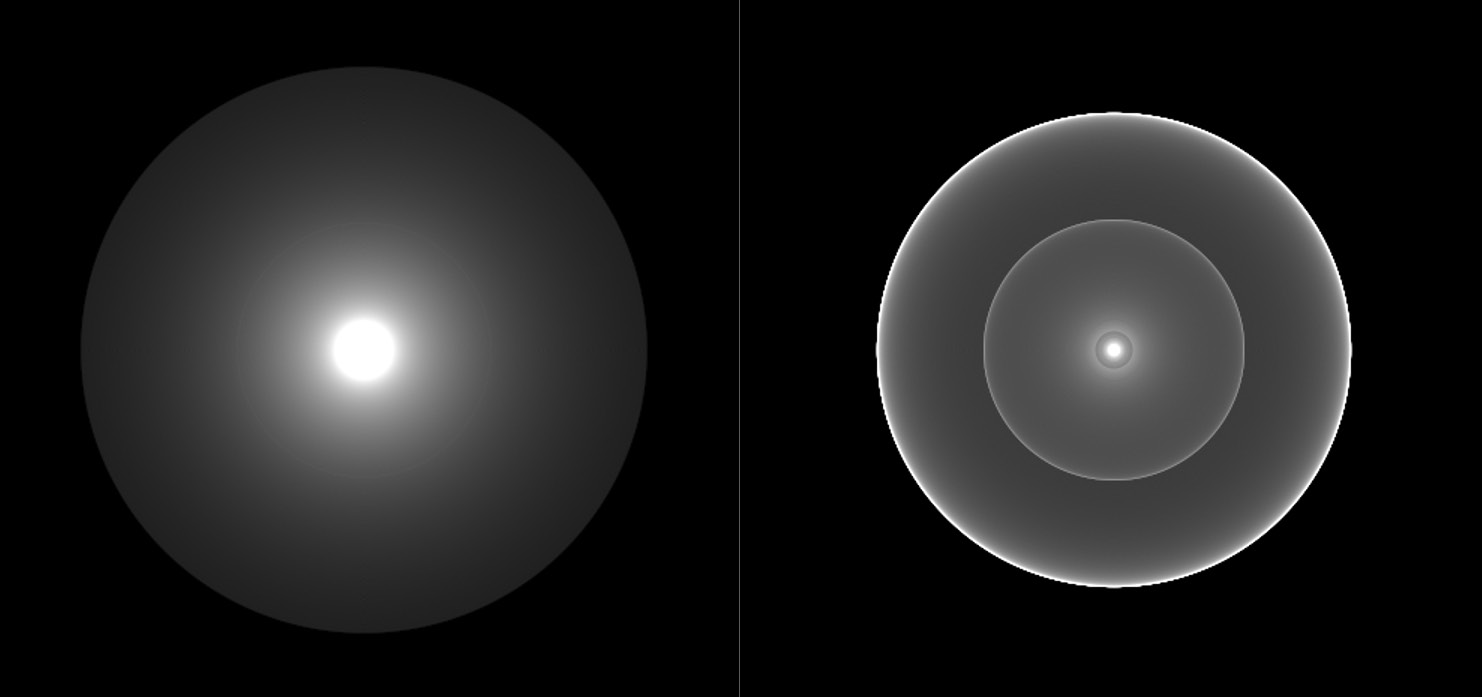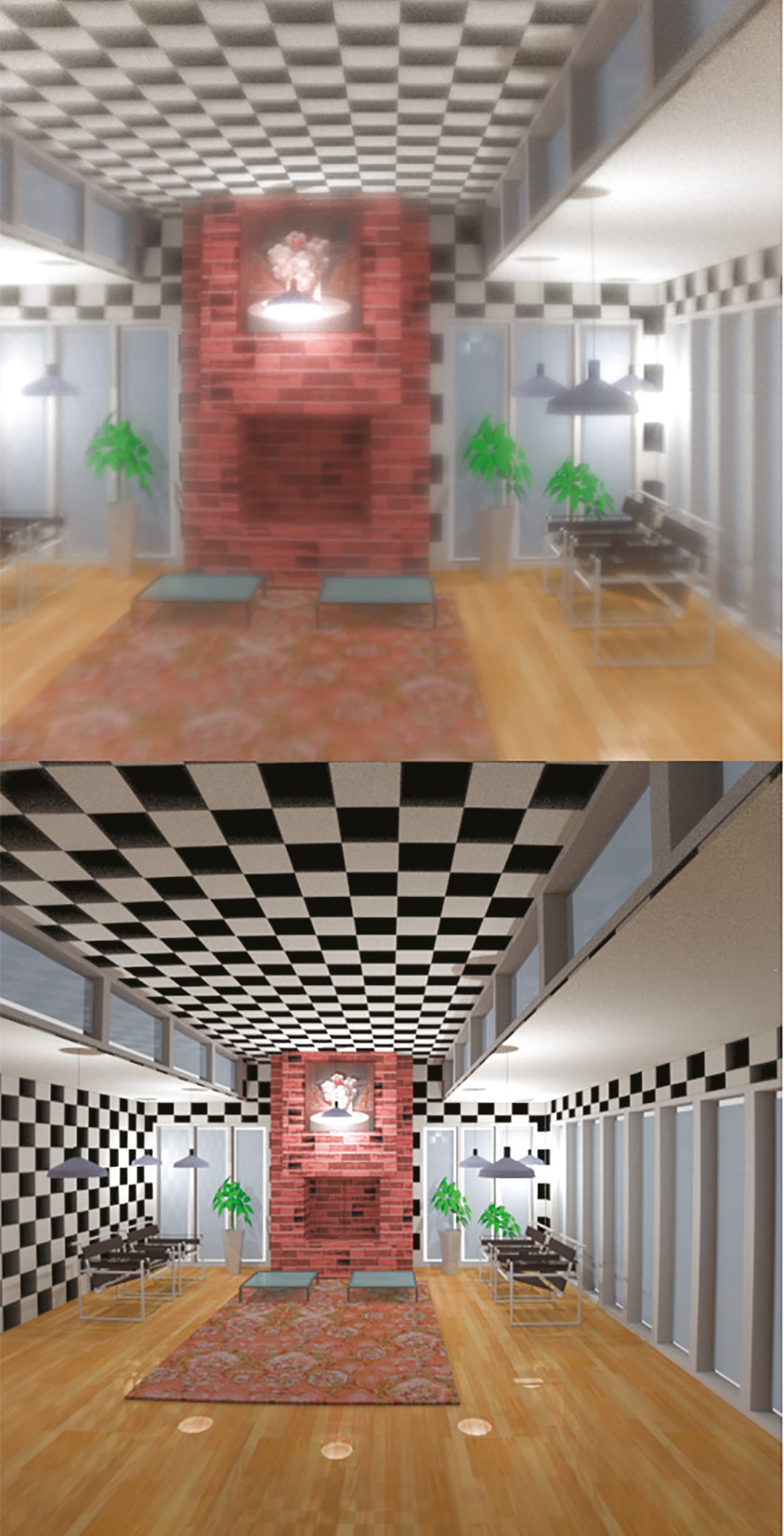 Изображения, формируемые четырех- и пятилинзовым объективами были рассчитаны для разрешения 600 × 600 точек и длины волны 0.5876 мкм. Число трассируемых лучей – 2.000.000.000. Диагональные поля зрения четырех- и пятилинзового объективов составили 37° и 47.5° соответственно. Время расчета составило 79.534 мс для четырехлинзового объектива и 122.134 мс – для пятилинзового объектива. Изображение, построенное для четырехлинзового объектива, представлено на верхней части рис. 12, для пятилинзового объектива – на нижней части рис. 12.