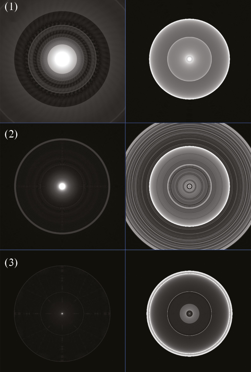 Были рассмотрены три варианта задания параметров радиального и углового разрешения треугольной сетки. Первый вариант – 24 × 54 (1.296 треугольников), второй вариант – 240 × 540 (129.600 треугольников), третий вариант – 2.400 × 5.400 (12.960.000 треугольников). Первый параметр – радиальное разрешение, второй – угловое. Были выполнены расчеты и проведена оценка отклонений ФРТ от эталонных значений. Поиск точки встречи луча с треугольной сеткой выполнялся средствами компьютерной графики [7]. Соответствующие изображения отклонений ФРТ от эталонных представлены на рис. 4. Размер изображения для четырехлинзового объектива, представленного на рис. 3а, был равен 100 мкм, для пятилинзового объектива, показанного на рисунке 3(б), – 5 мкм. Разрешение изображения в обоих случаях составляло 500 × 500 точек. Относительное среднеквадратичное отклонение ФРТ от эталона представлено в табл. 1.