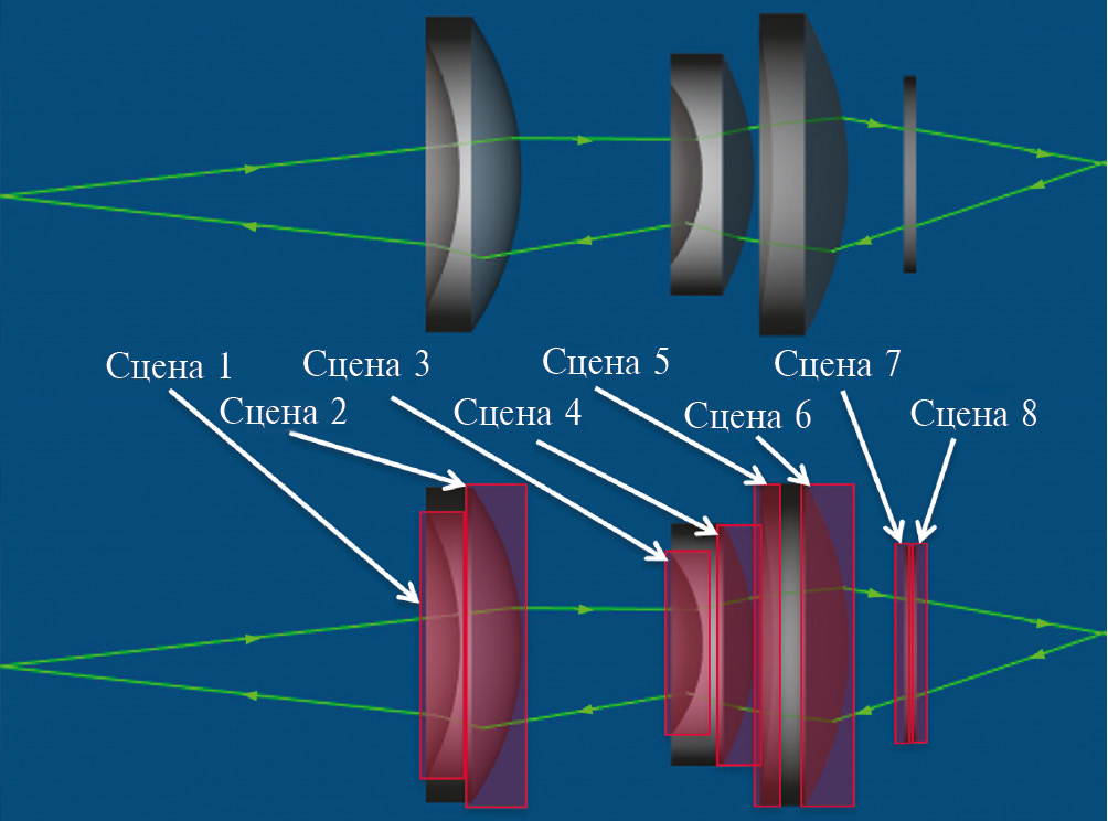 Рис. 5. Оптическая система объектива (верхний рисунок), представленная в виде набора Embree сцен (нижний рисунок)