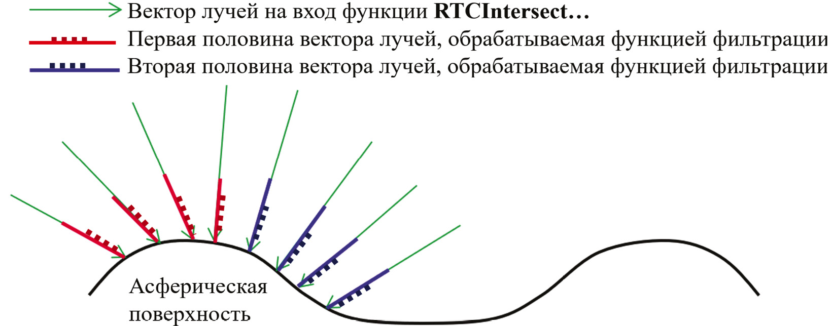 Одним из недостатков API Embree с точки зрения вычислительной оптики является то, что все расчеты с вещественными числами выполняются с вещественными числами одинарной точности, тогда как в вычислительной оптике используются вещественные числа с двойной точностью. Одинарная точность может быть недостаточна, особенно если степень полинома асферической поверхности достигает нескольких порядков, а луч сильно отклоняется от своей расчетной траектории, например, это возникает при расчете бликов. Поэтому для повышения точности вычислений используются специальные фильтрующие callback-функции, устанавливаемые средствами API Embree (rtcSetGeometryIntersectFilterFunction). Функция фильтрации вызывается при каждом выполнении операции поиска точки встречи луча с поверхностью (RTCIntersect…) и может изменить параметры точки встречи луча с поверхность, т. е. точка пересечения, найденная с одинарной точностью, может быть пересчитана в двойную точность. Для вычислений, использующих векторные инструкции процессора, обработка несколько усложняется, поскольку вектор, состоящий из восьми вещественных чисел одинарной точности, необходимо преобразовать в два вектора из четырех вещественных чисел двойной точности, которые будут последовательно обрабатываться функцией фильтрации. Данный процесс проиллюстрирован на рис. 6.